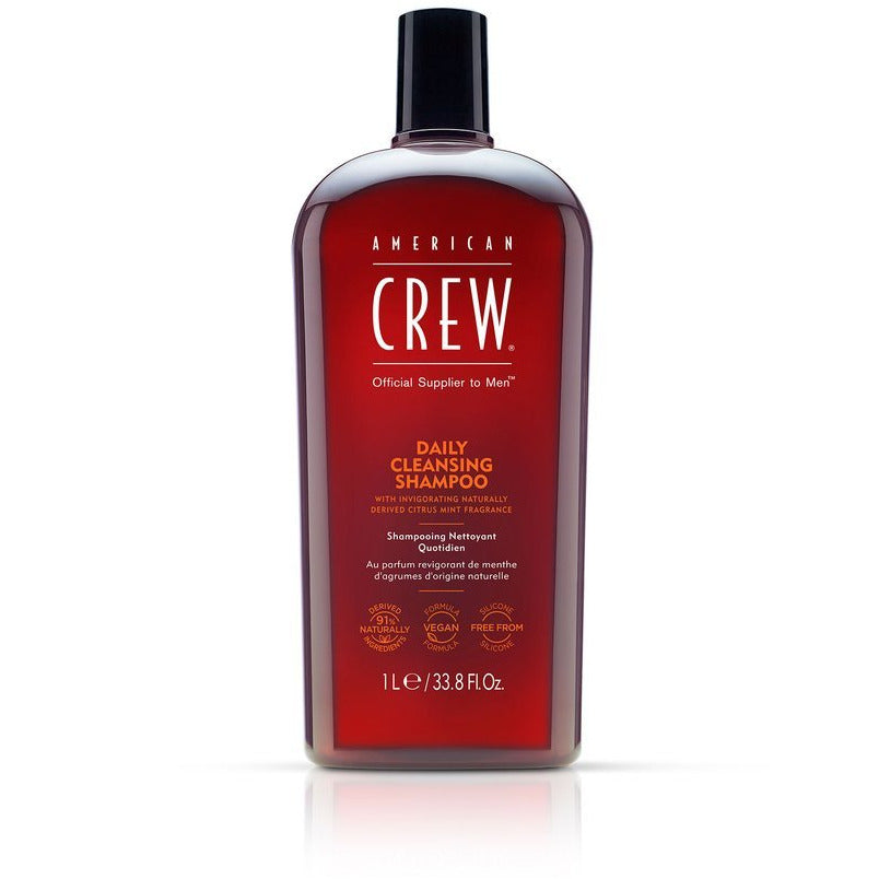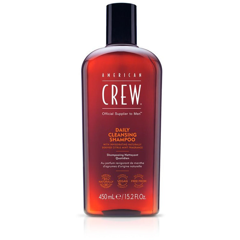 NEW Renovation of Daily Shampoo Enriched with Vitamin B5 for moisture, our silicone-free Daily Cleansing Shampoo is ideal for an everyday haircare routine. The nondrying vegan formula washes away excess oil, leaving hair more manageable, looking healthy, and feeling soft. Infused with our energizing, naturally certified American Crew Citrus Mint signature fragrance. Best for men with normal to oily hair and scalp. BENEFITS Washes away excess oil on hair and scalp. Vitamin B5 gives moisture promoting healthy looking hair. Formulated with 91% naturally derived ingredients. Packaging made with a minimum of 80% Post-Consumer Recycled Plastic in retail sizes USAGE Wet...
