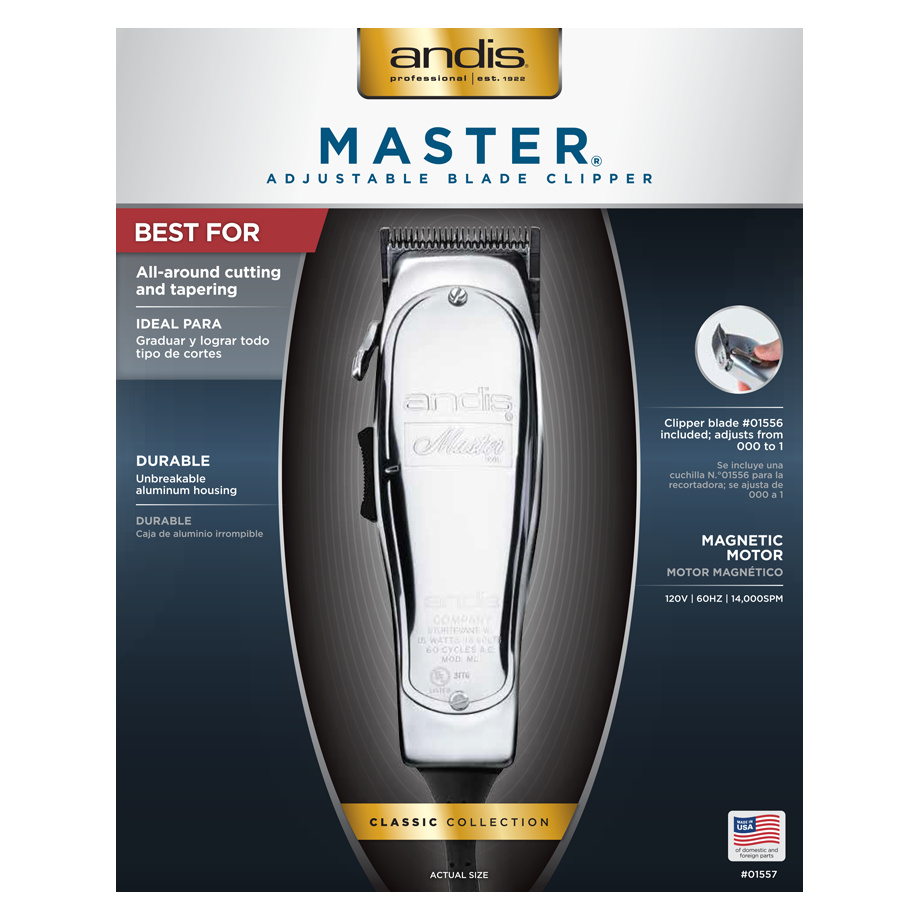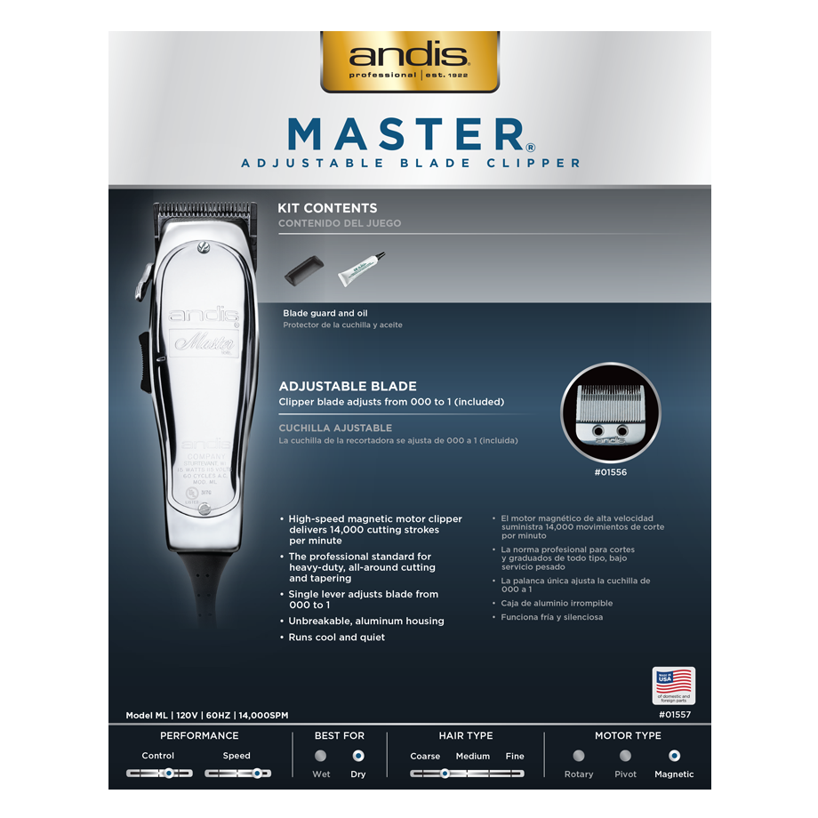 • High-speed magnetic motor clipper delivers 14,000 cutting strokes per minute.• The professional standard for heavy-duty, all-around cutting and tapering.• Single lever adjusts blade from 000 to 1.• Unbreakable aluminum housing.• Runs cool and quiet.