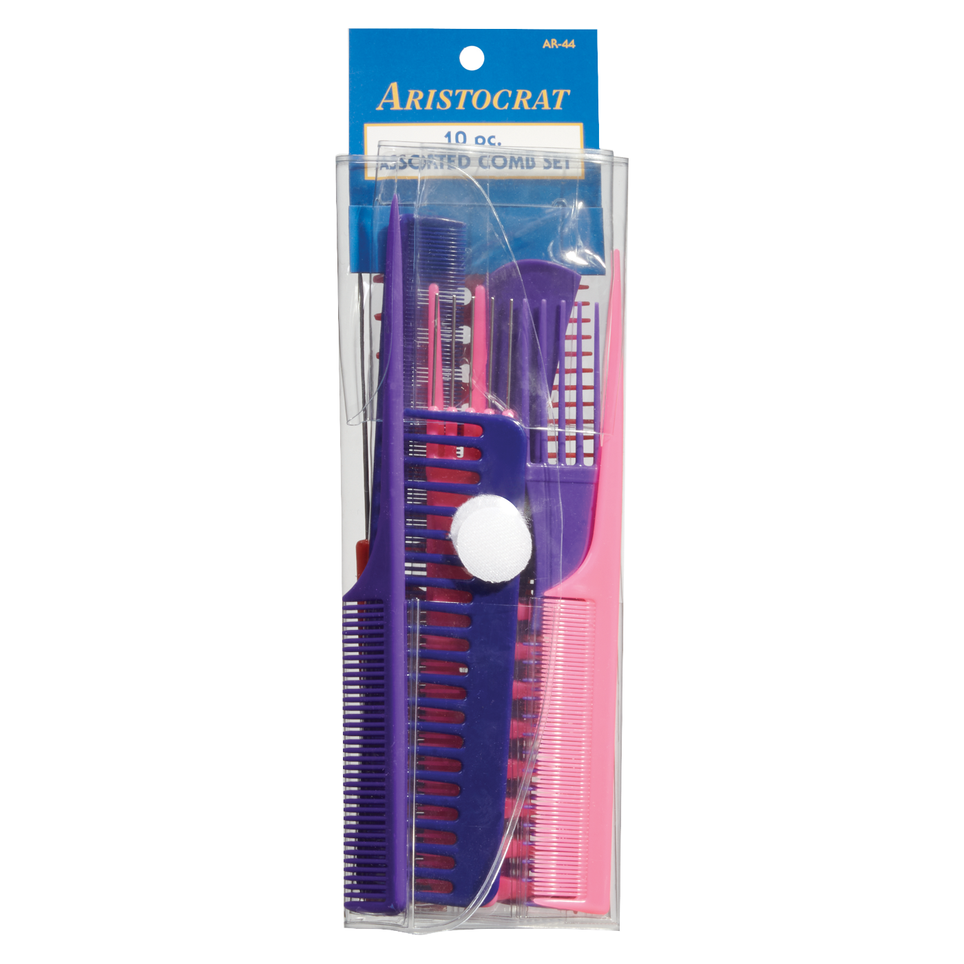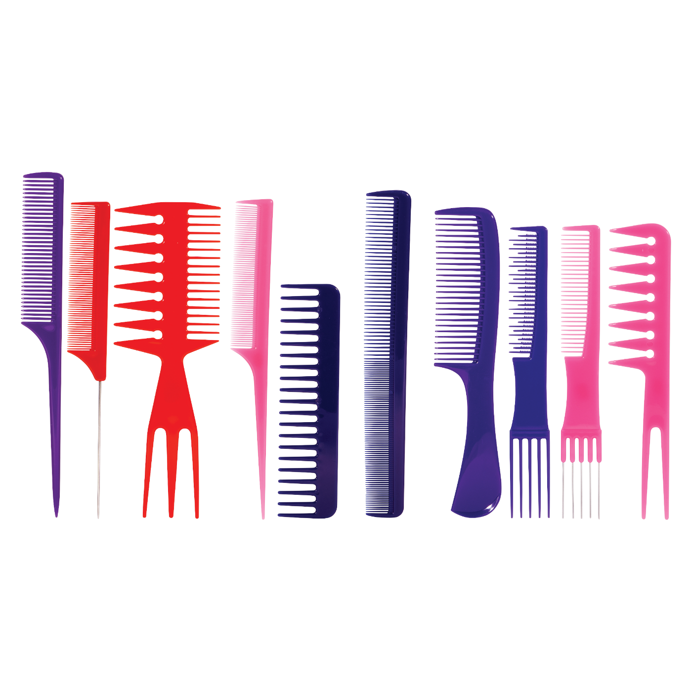 Assortment of ten colorful combs are ideal for teasing, smoothing, detangling, and styling hair.