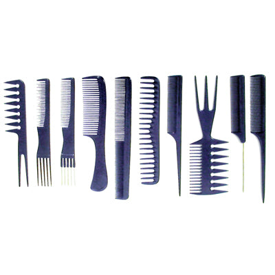 Aristocrat 10 pc. professional comb set includes 1 of each: wide tooth rat tail comb, fine tooth pin tail comb, 3 in 1 comb, fine tooth rat tail comb, wave comb, cutting comb, rake comb, dual purpose comb with metal lift, dual purpose comb with plastic lift and a swallow styler pik. All enclosed in an attractive clear plastic roll-up.