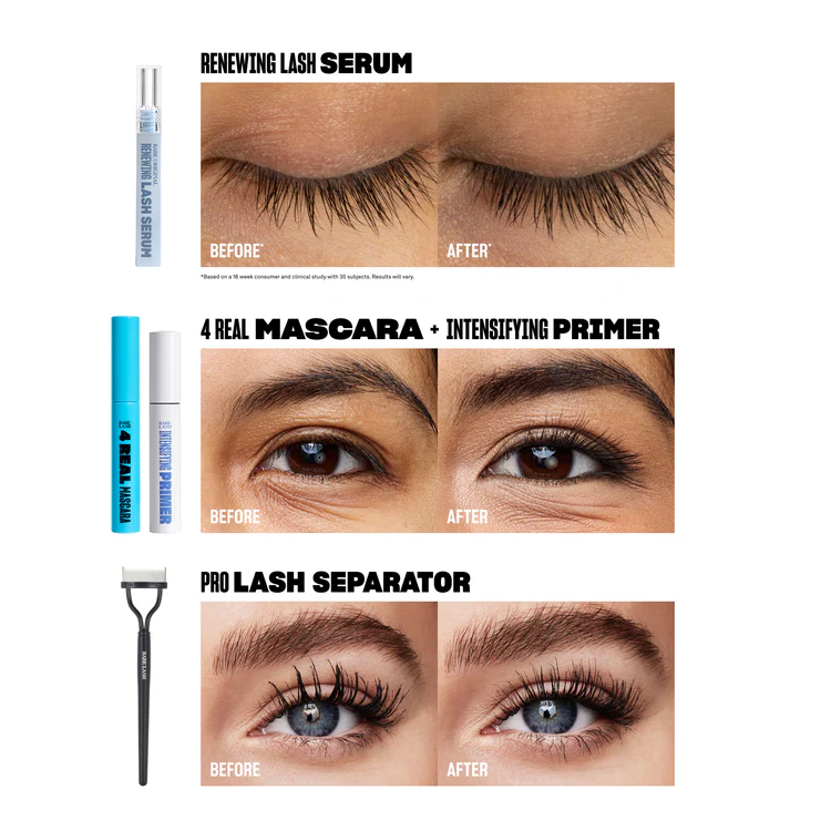 Featuring our Renewing Lash Serum, a peptide-powered formula that promotes fuller and longer-looking lashes in just 6 weeks*, plus Intensifying Lash Primer, 4 Real Mascara, and the Pro Lash Separator, this limited-edition bundle works to lengthen, volumize, and define natural lashes.