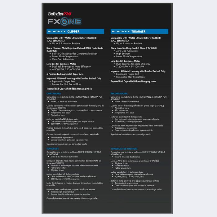 The BlackFX Clipper is equipped with a black titanium ultra-thin fade blade that offers constant lubrication through its built-in oil reservoir, ensuring smooth, low-heat operation for all-day use. The BlackFX Trimmer offers a hypoallergenic, deep-tooth T-blade for detailed, irritation-free cutting. The powerful motor operates at 7,200 RPM, enabling precise trimming, and the tapered end cap includes a hidden hook for easy storage. This tool-only prepack is compatible with the FXONE interchangeable lithium battery, sold separately, and is an ideal addition for pros with FXONE battery setups.