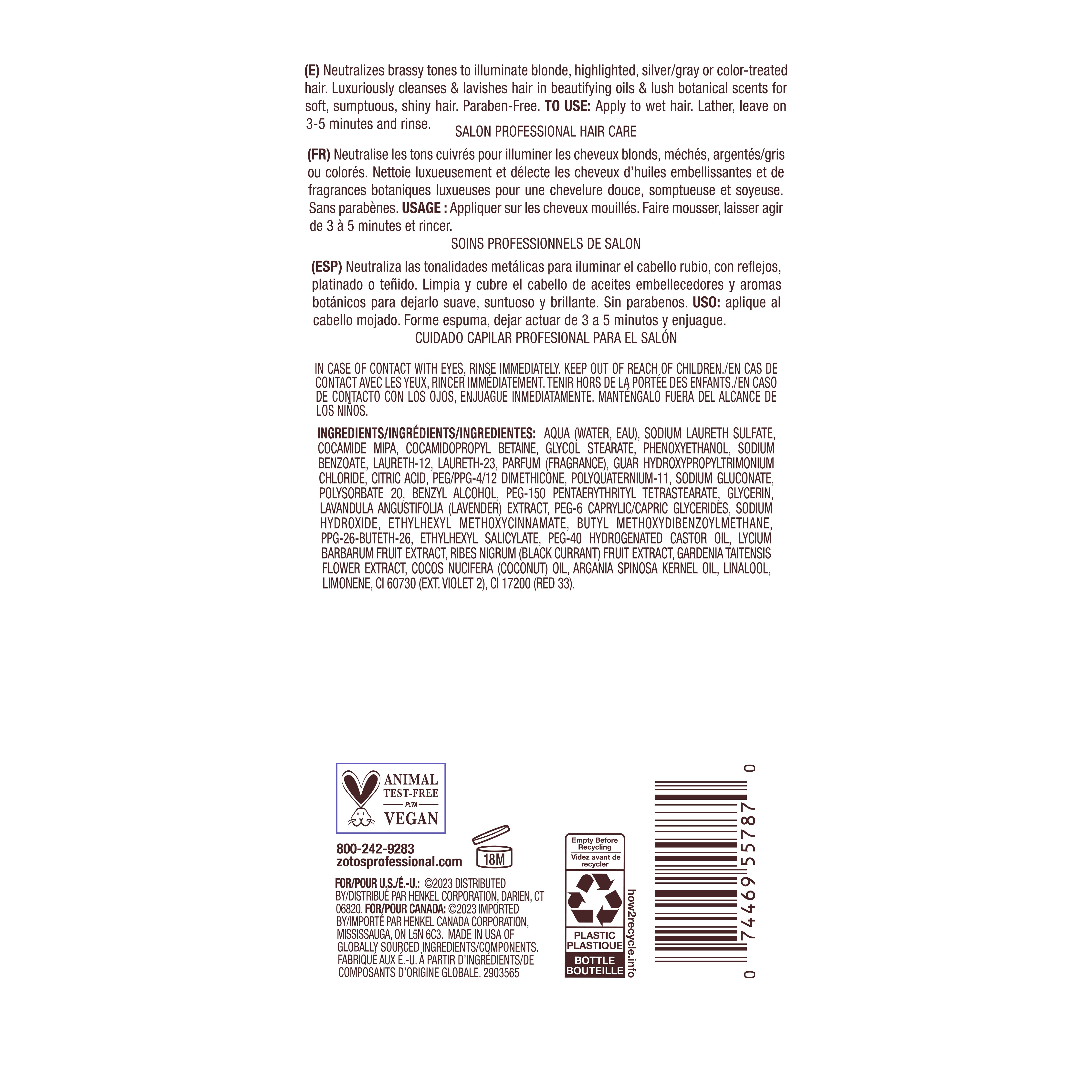 Neutralizes brassy tones and illuminates blonde, highlighted, silver/gray or color-treated hair for visible color enhancement and ultimate color longevity. Luxuriously cleanses and lavishes in beautifying oils & lush botanical scents for soft, sumptuous, silky perfection. Paraben-free.