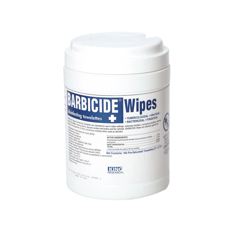 Time is money and BARBICIDE® Disinfecting Wipes maximize both! These economical, easy to use disinfecting wipes are EPA registered and have a 2 minute contact time assuring your salon, spa or barbershop meet disinfection guidelines in just a few short minutes. Proven effective against HIV-1, Hepatitis B, Hepatitis C, Staphylococcus (including MRSA), Pseudomonas, Salmonella, Clostridium Difficile (C.Diff), Vancomycin-Resistant Enterococcus (VRE), Herpes, Influenza (including H1N1), “Athletes Foot” (Tinea Pedis) and Mycobacterium Tuberculosis Complies with OSHA’s bloodborne pathogens standard Safe for acrylic tanning beds, stainless steel, plastics, combs and shears More disinfecting solution per towelette than the industry standard Superior surface...
