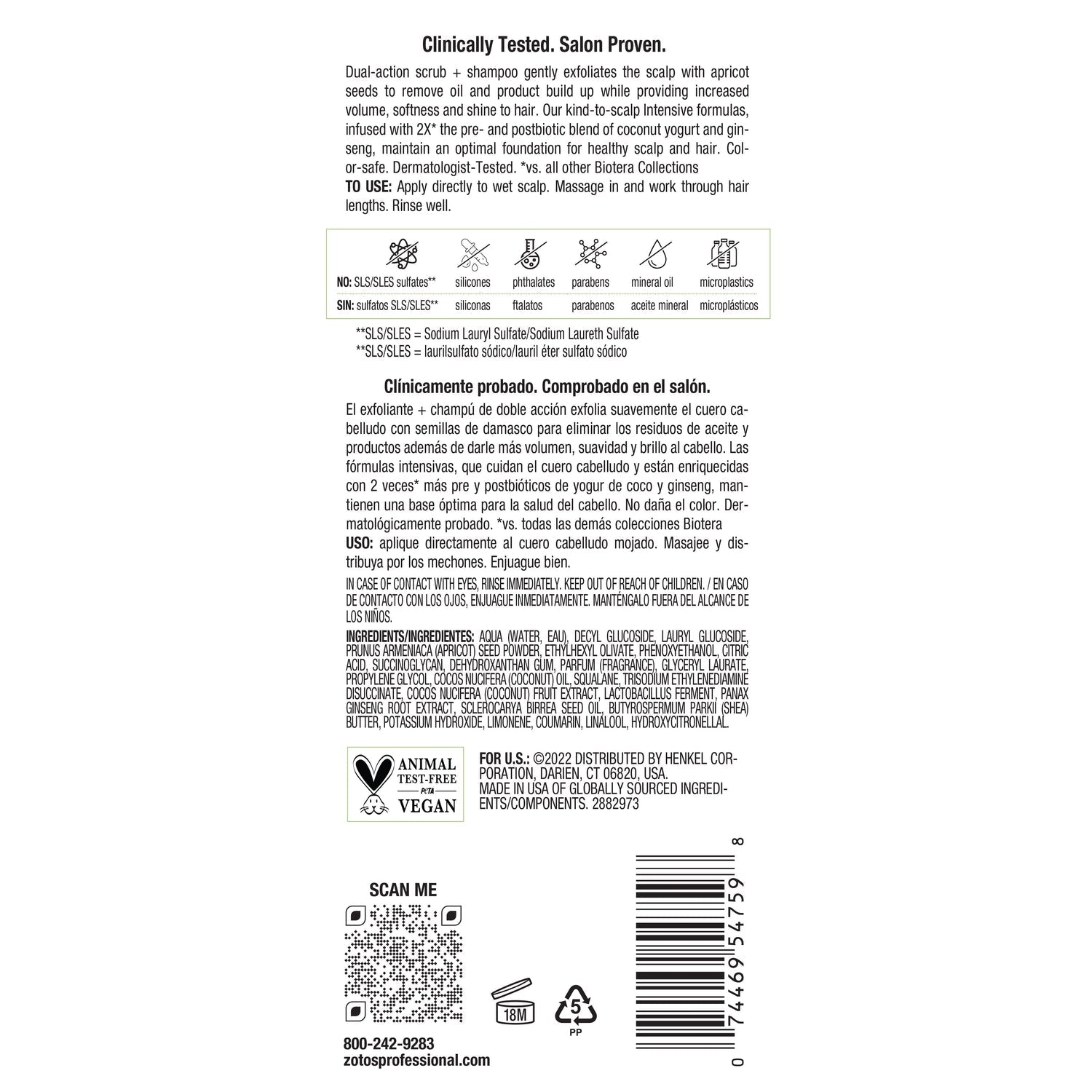 Clinically Tested. Salon Proven.Dual-action scrub + shampoo gently exfoliates the scalp with apricot seeds to remove oil and product build up while providing increased volume, softness and shine to hair. Our kind-to-scalp Intensive formulas, infused with 2X* the pre- and postbiotic blend of coconut yogurt and ginseng, maintain an optimal foundation for healthy scalp and hair. Col-or-safe. Dermatologist-Tested.*vs. all other Biotera Collections