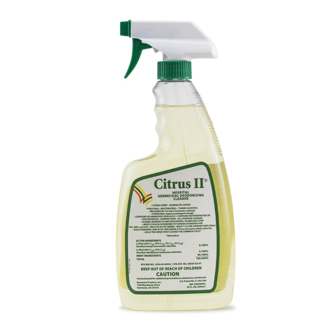 Citrus II Hospital Germicidal Deodorizing Cleaner is designed specifically as a general, non-acid, ready-to-use cleaner and disinfectant.Efficacy tests have demonstrated that this product is an effective bactericide, virucide, and fungicide. It is formulated to disinfect hard, non-porous, inanimate, environmental surfaces, equipment and non-critical instruments. In addition, Citrus II Germicidal Cleaner deodorizes those areas which generally are hard to keep odor free.The 22 fl. oz. spray is perfect for quick use and cleanup and is available in both the original Fresh Citrus and Clean Lavender fragrances.