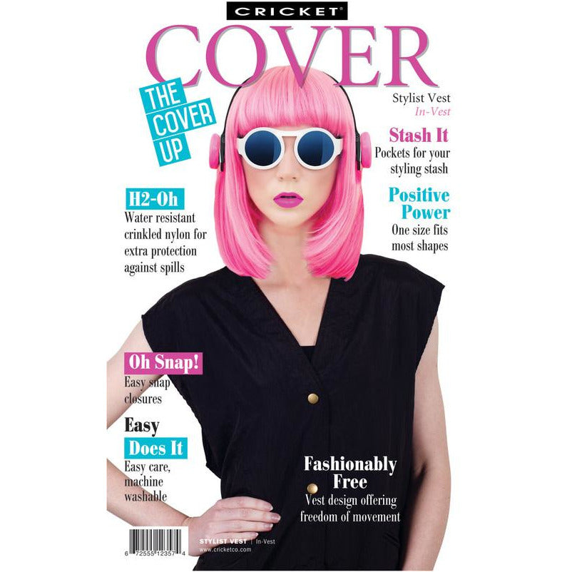 So fabulously freeing! Our In-Vest Black Stylist Cover Up has a unique vest design with easy snap closure to give you maximum comfort and the freedom to move. Made from a water-resistant crinkled nylon material, In-Vest provides extra protection against spills. The one-size vest fits most shapes and it is machine washable for easy care!