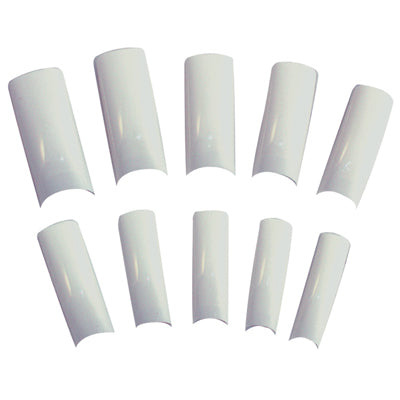 Contains 300 square white French nail tips in 10 different sizes, in a compartmentalized, clear plastic case.