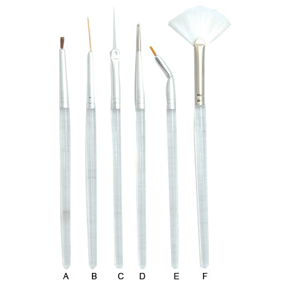 6 pc nail art brush set includes: Fan brush, Angled Detail brush, Dotting tool, Long Striping brush, Short striping brush and Detail brush.