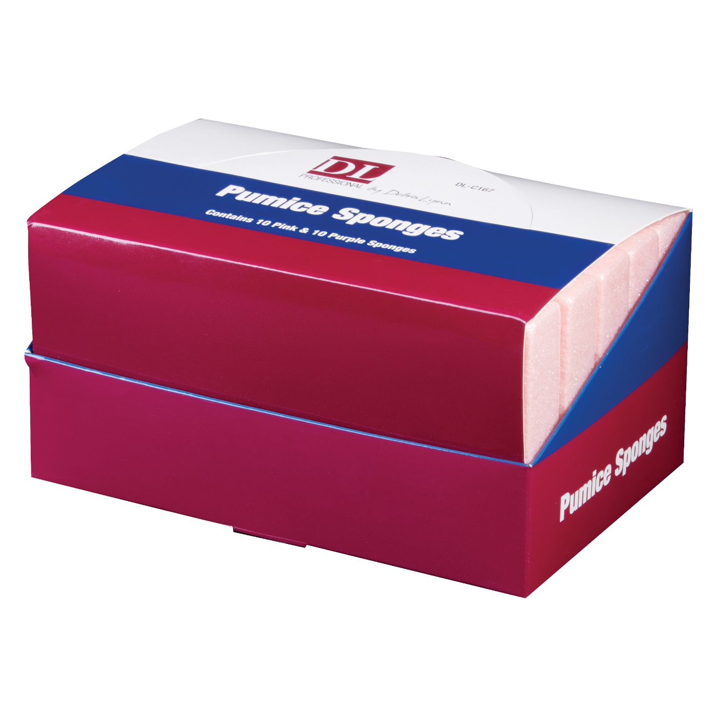 Display of 20 pumice sponges in purple and pink.