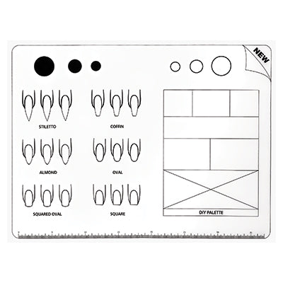 Nail art mat provides the perfect work surface for practicing designs and creating custom decals for a variety of nail shapes. Features 18 nail tip guides, 6 circles for testing color combinations, a DIY palette section, and a ruler. Reusable silicone surface allows for easy cleaning and can be folded or rolled up for storage or travel. Measures 15-1/2"W x 11-3/4"H.