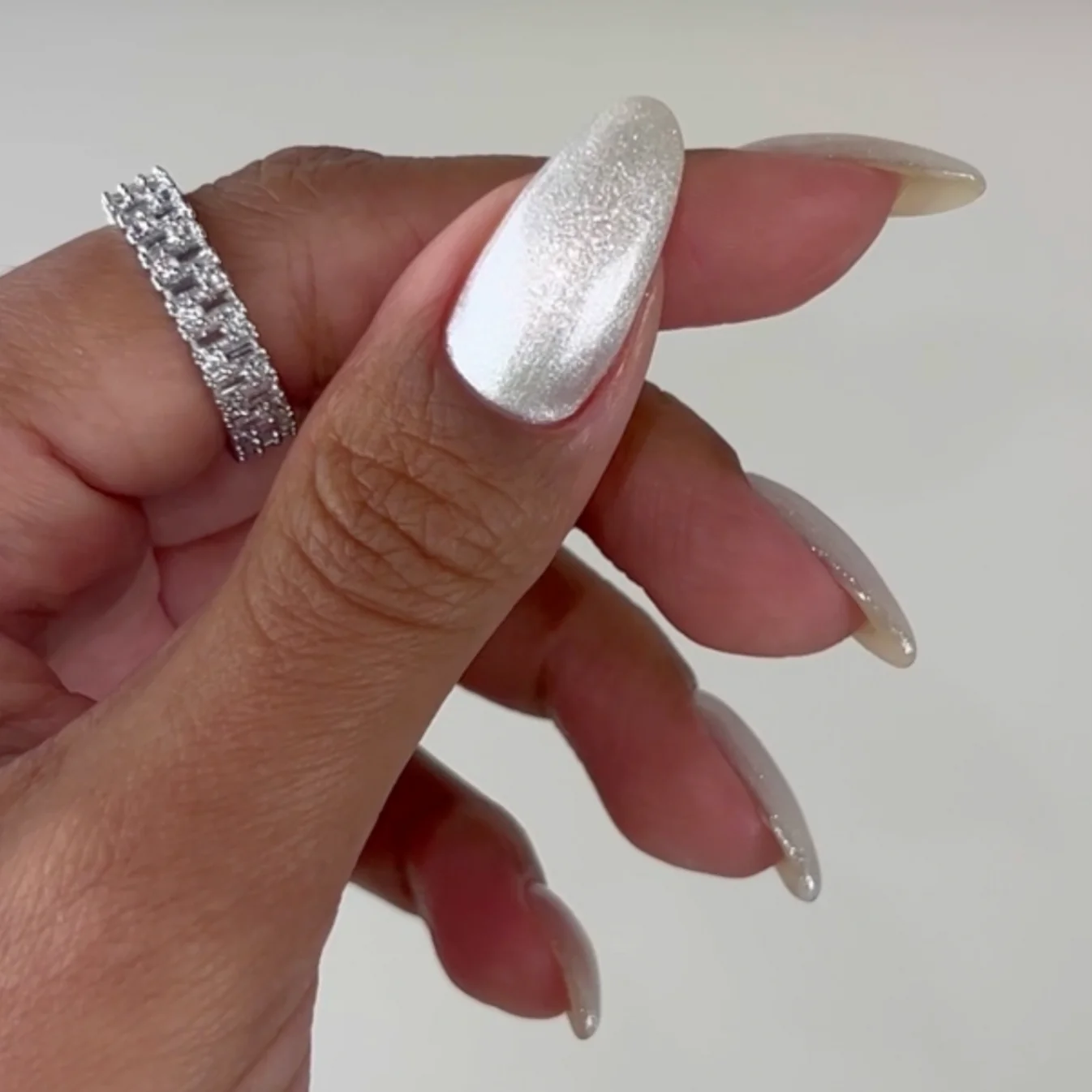 Crystal Aura #893 — Let your fingertips sparkle like freshly fallen snowflakes under the sun. This shade blends the purity of silvery white with a soft sheen, perfect for a queen who keeps her cool in any situation.