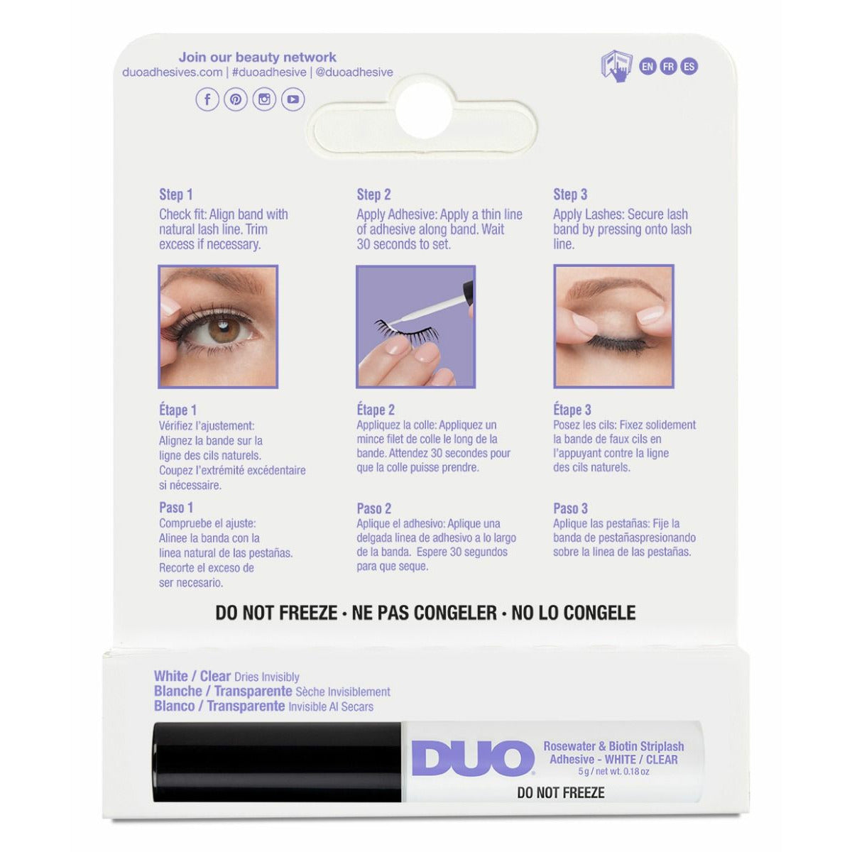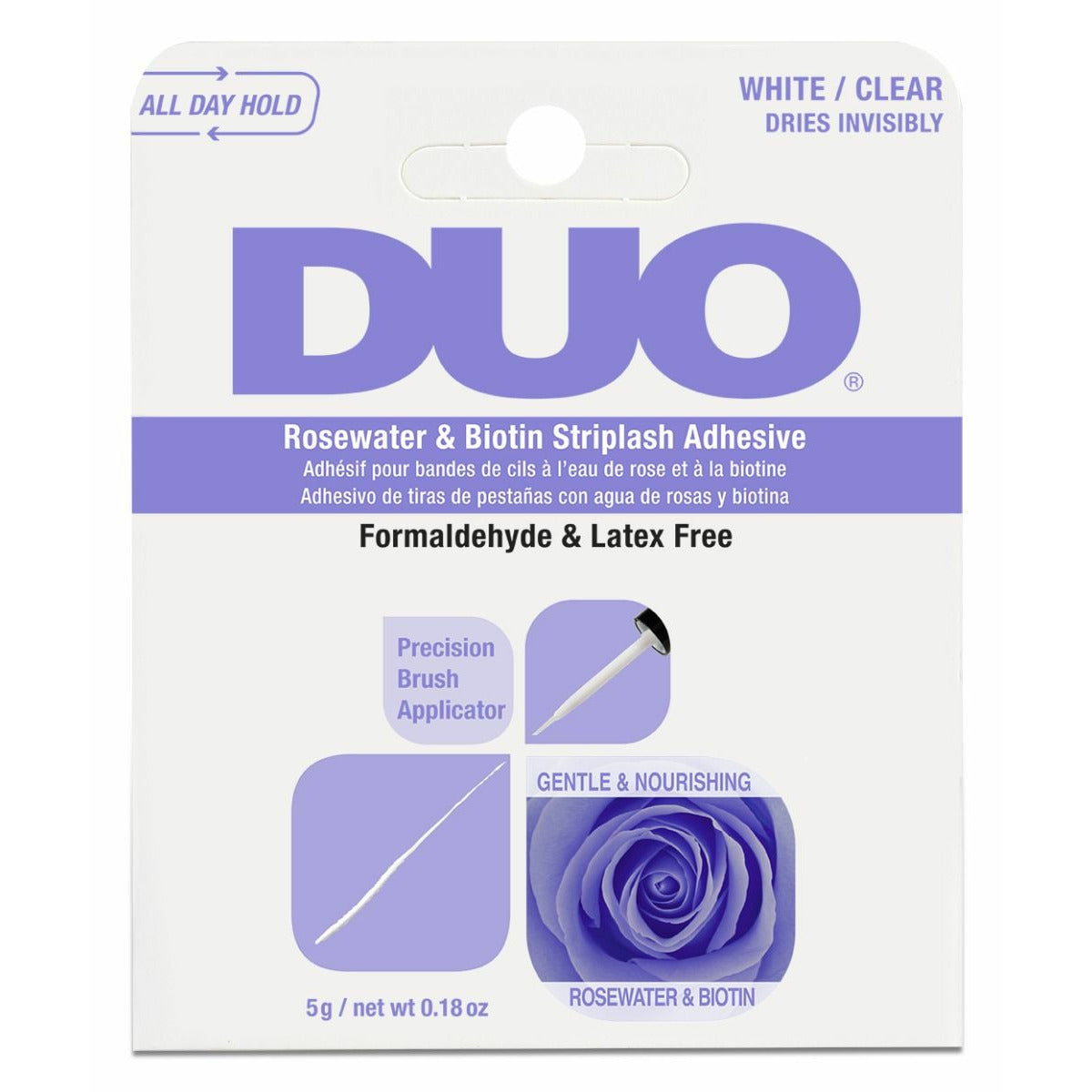 DUO's clear striplash adhesive features a nourishing formula that's infused with biotin and rosewater and is both formalehyde and latex free! Same iconic long-lasting hold..