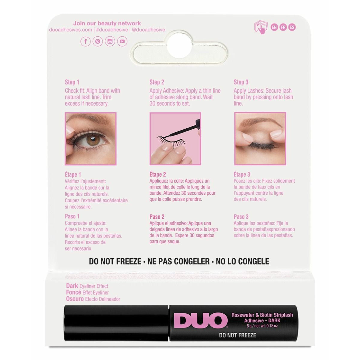 DUO's dark striplash adhesive features a nourishing formula that's infused with biotin and rosewater and is both formalehyde and latex free! Same iconic long-lasting hold.