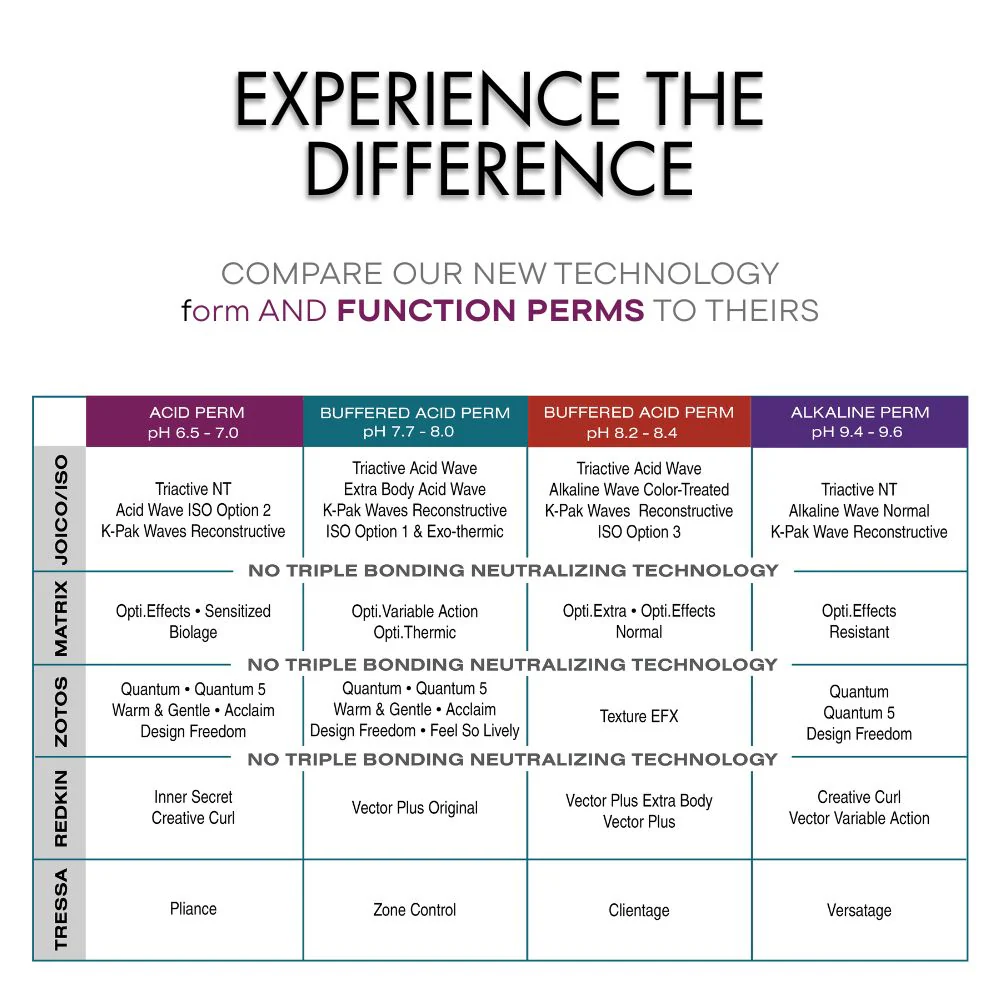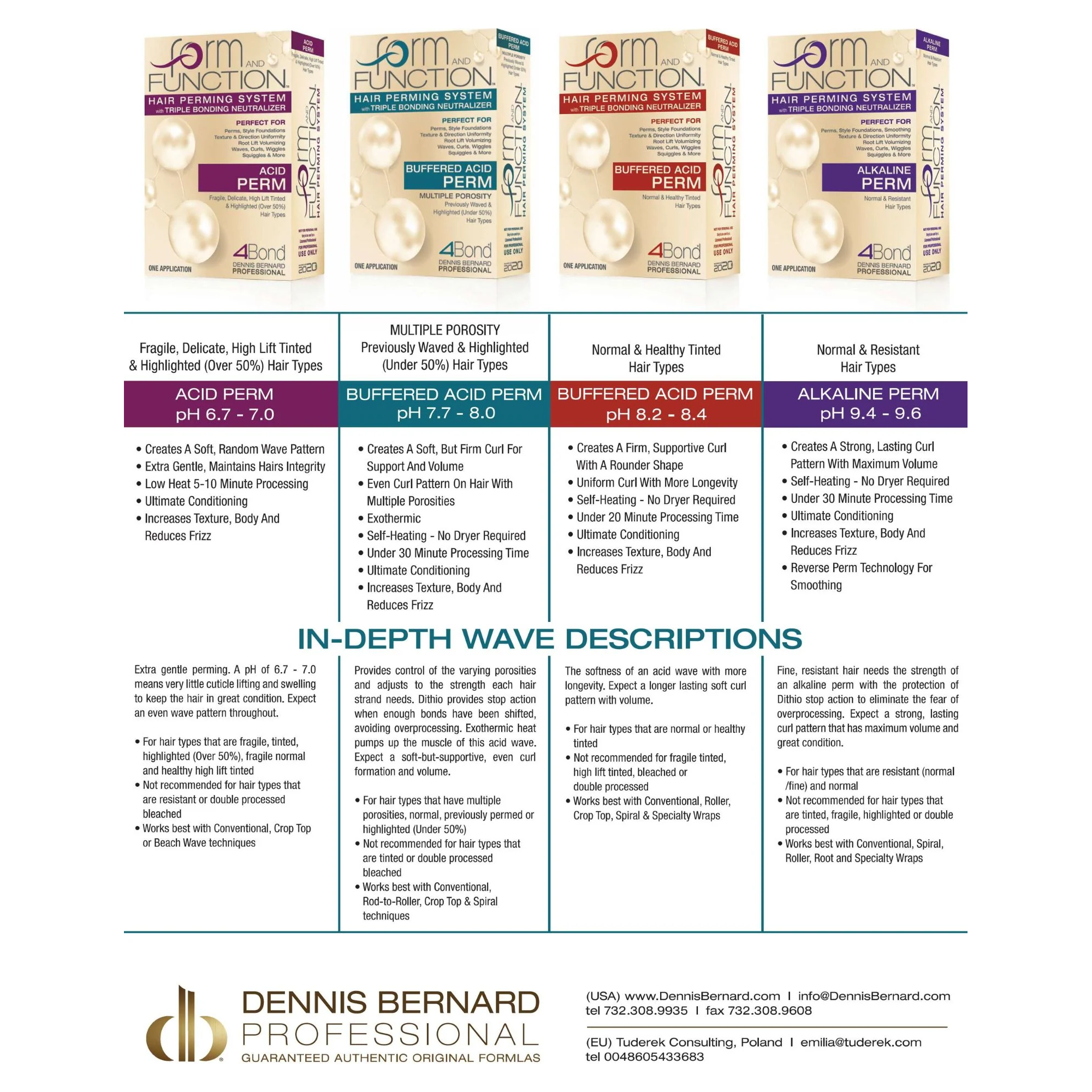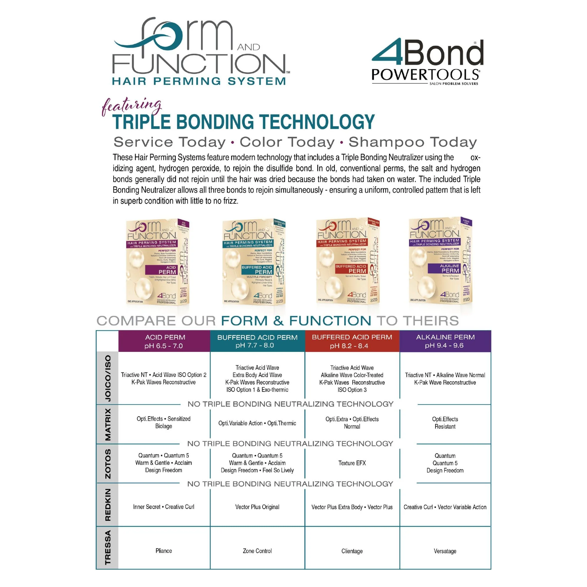 4Bond form AND FUNCTION Buffered Acid, for previouslywaved, tinted & highlighted hair. This Buffered Acid perming system features modern technology that includes a triple bonding neutralizer using the oxidizing agent, hydrogen peroxide, to rejoin the disulfide bond. In old, conventional perms, the salt and hydrogen bonds generally did not rejoin until the hair was dried, because the bonds had taken on water. The included triple bonding neutralizer allows all three bonds to rejoin simultaneously ensuring a uniform, controlled pattern that is left in superb condition with little to no frizz.
