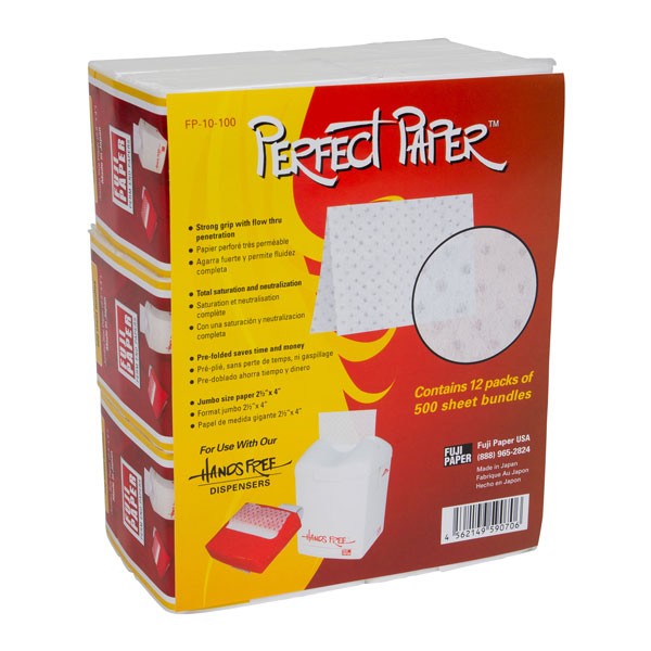 Fuji Perfect Perm Papers are the best end papers for perms and body waves. The strength of the sheets surpass all others. With a strong grip and flow through penetration, Fuji Perm End Papers have total saturation and neutralization when doing perms. Each paper is pre-folded which saves you time and money. No more waste and hassle of picking up each paper individually. These perm papers can be easily dispensed from any Fuji Hands Free Dispenser. Perfect Paper perm end papers are made in Japan.
