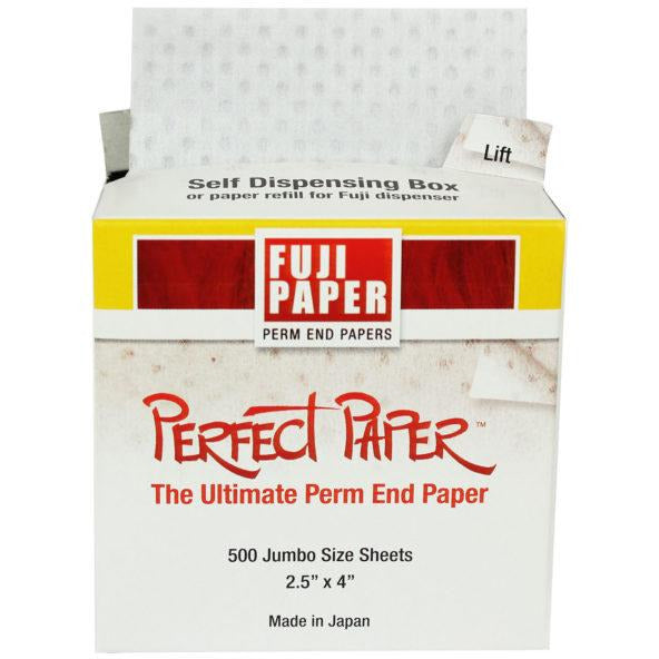 HAIRSTYLISTS LOVE THIS SELF-DISPENSING OPTION! The Fuji Perfect Paper Self-Dispensing Box is where dispenser meets end paper and functions as an all-in-one choice! It contains 500 sheets and acts as a self-dispenser or a refill for Hands-Free Dispensers. Fuji Perfect End Papers are the best end papers for perms and body waves. The strength of the sheets surpass all others. With a strong grip and flow through penetration, Fuji Paper End Papers offer 400% more saturation than other end papers on the market. Each paper is pre-folded which saves you time and money. No more waste and hassle of picking up each paper individually. These perm papers can be easily dispensed from any Fuji Hands-Free Dispenser. Perfect Paper end papers are made in Japan.