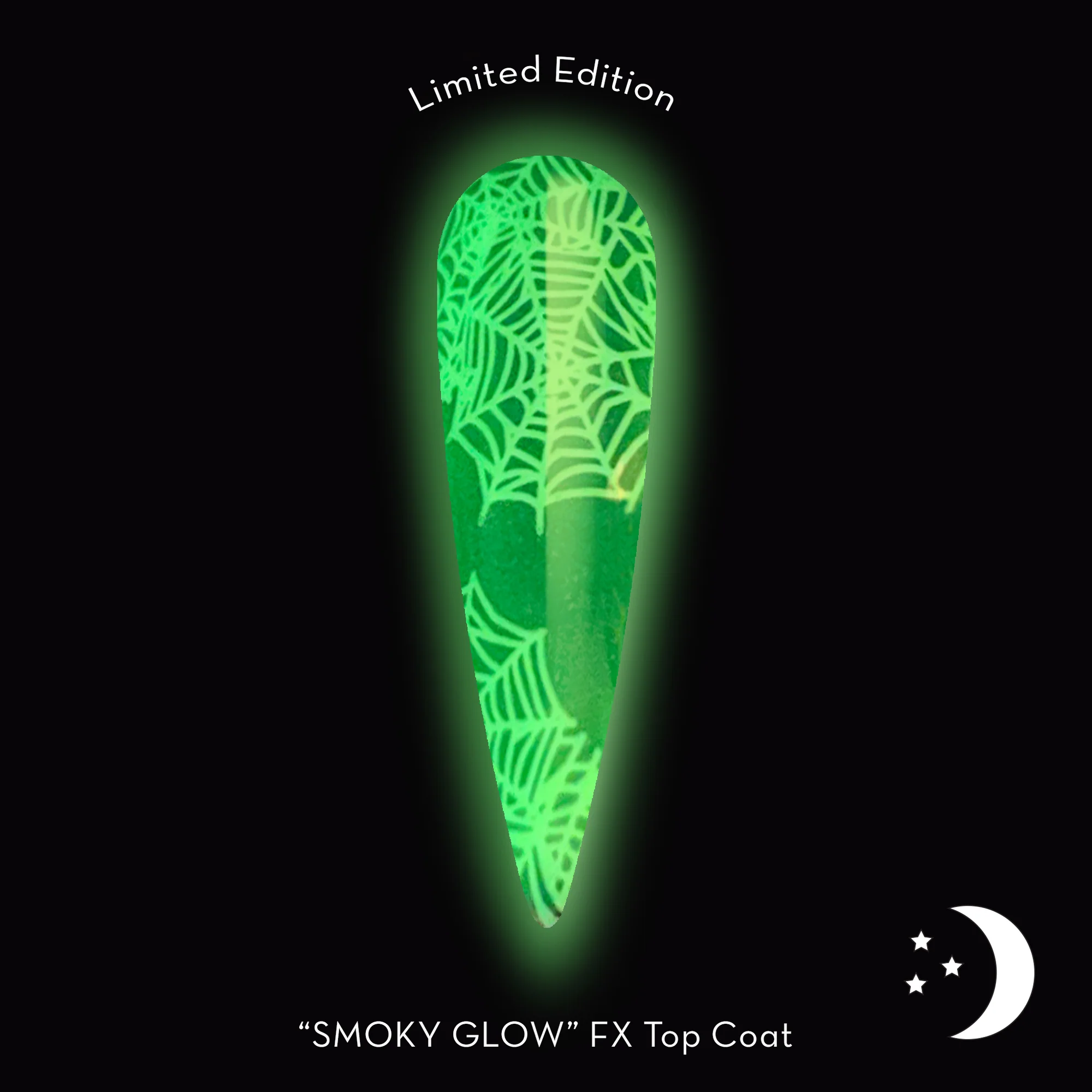 Smoky Glow Top Coat has a light 'veil' effect in the light, and a vibrant green glowing effect in the dark! Limited edition, while supplies last!