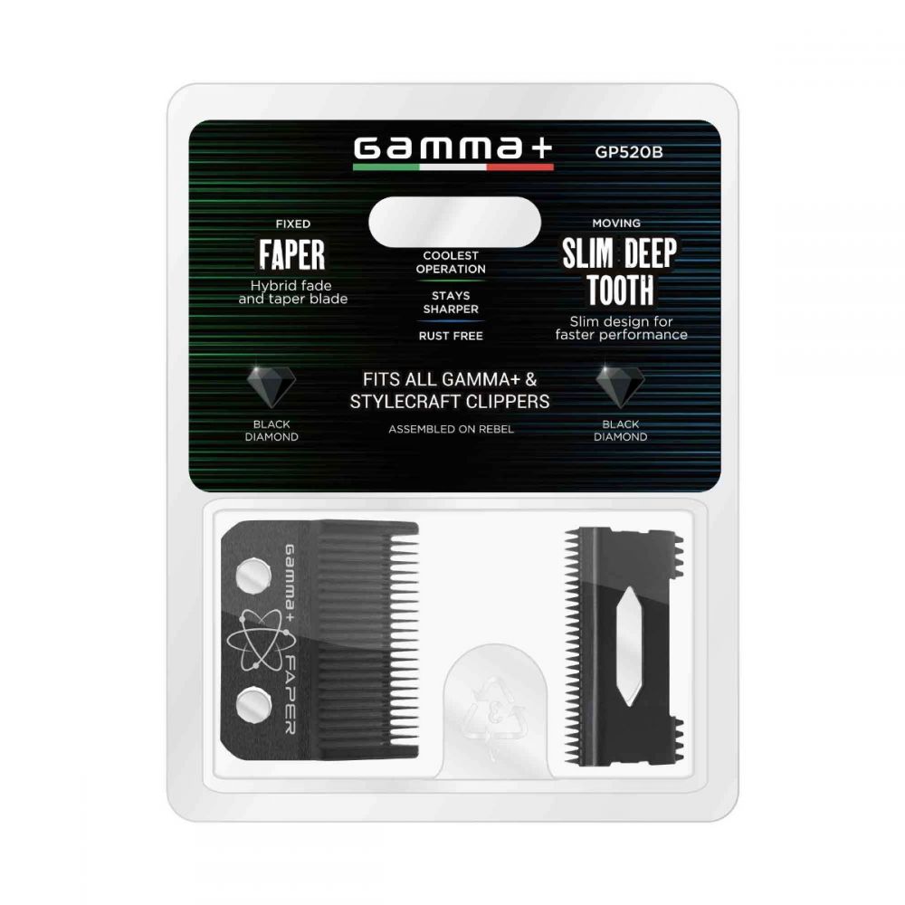 Still sharp? It might be time to replace your blade. The Black Diamond Carbon DLC fixed clipper Faper blade is a hybrid between a fade and taper blade. It is thinner than a taper blade and similar to a fade blade in thickness but still has a ridges like a taper blade. Our Faper blades are great all-around blades, excellent for taking out the bald skin line. The moving slim deep tooth cutter blade is ideal for all general cutting and allows for faster movement. This package includes both the Black Diamond Carbon DLC fixed Faper clipper blade and a moving slim tooth cutter as a set. This fixed and moving blade is compatible with all GAMMA+ and StyleCraft clipper models.