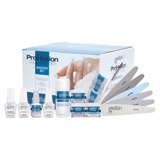 4 Fl. Oz. Nail Sculpting Monomer, 1 Oz. Elegant Pink Powder, 0.5 Fl. Oz. pH Bond, 1 Oz. Crystal Clear Powder, 0.5 Fl. Oz. ProBond, 1 Oz. Vivid White Powder, 0.5 Fl. Oz. Dual Coat, 0.5 Fl. Oz. Nourish, Pro 9 Brush, 150/150 File, 180/180 File, 100/180 Buffer, 220/280 Buffer, 400/4000 Shiner, 240/240 Thin Wooden File, and 100 pack white Nail Forms