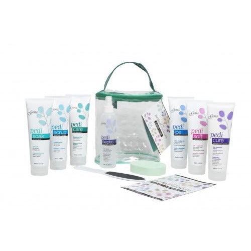 Includes 8.4oz Pedi Soak, Pedi Scrub, Pedi Care, Pedi Septic, Pedi Ice, Pedi Soft, Pedi Cure, as well as files, accessories, and a lovely bag.