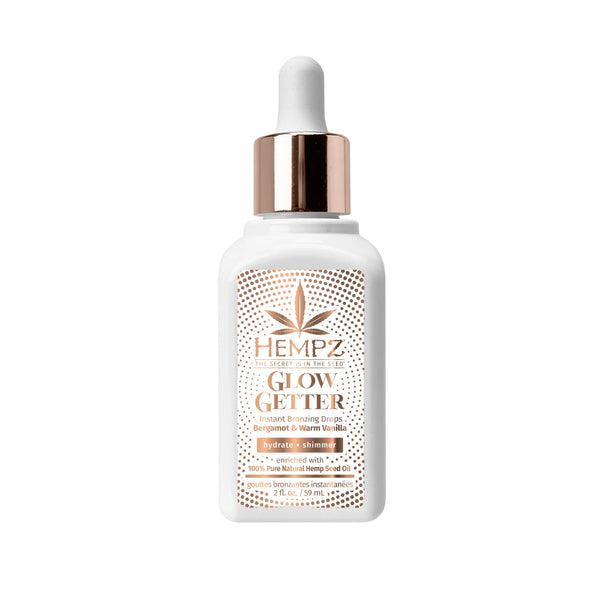 Get that sun-kissed radiance instantly with Glow Getter Herbal Instant Bronzing Drops, infused with 100% pure hemp seed oil, and leave skin with the refreshing scent of bergamot and vanilla, giving you a luminous glow with every drop. 2 fluid ounces in a dropper bottle.