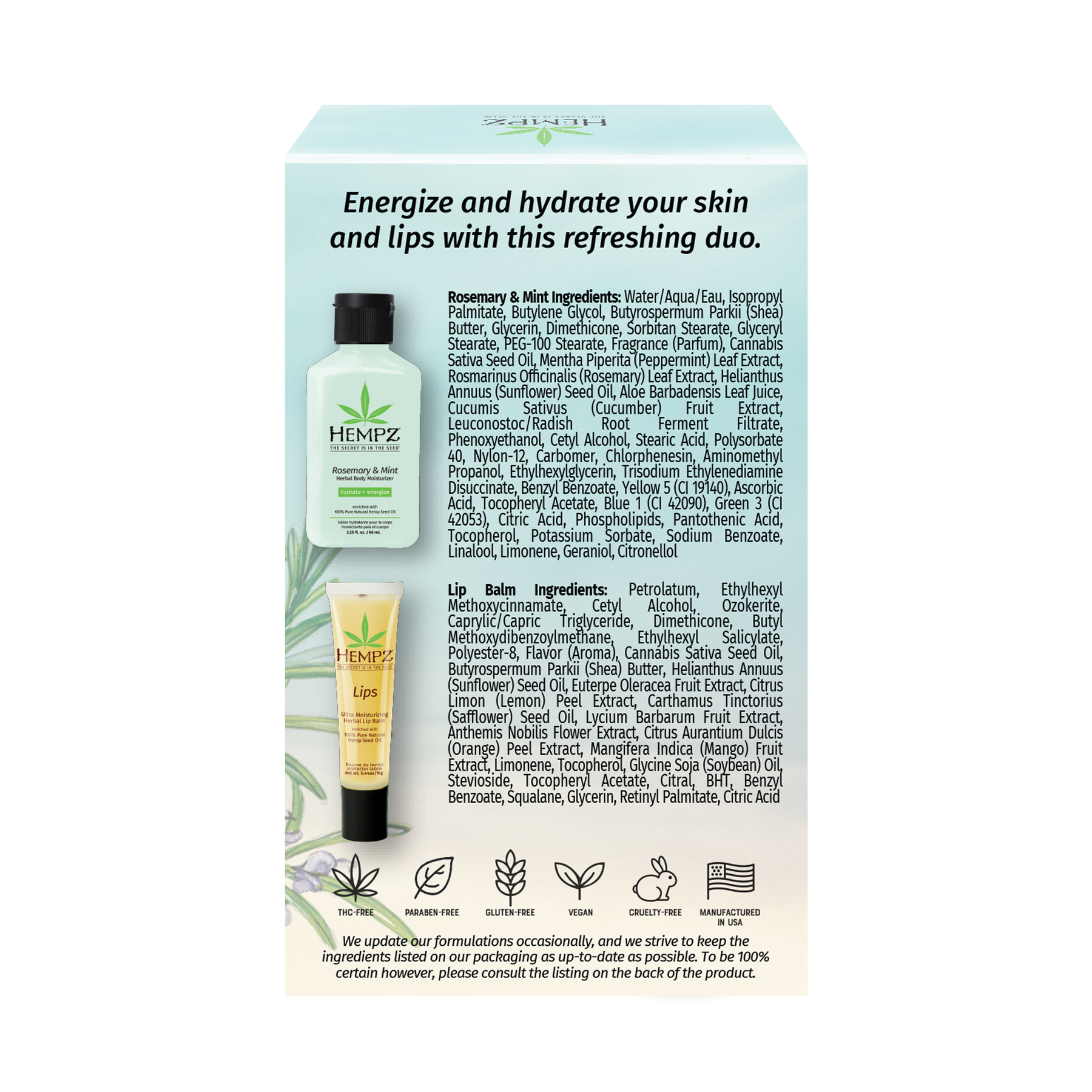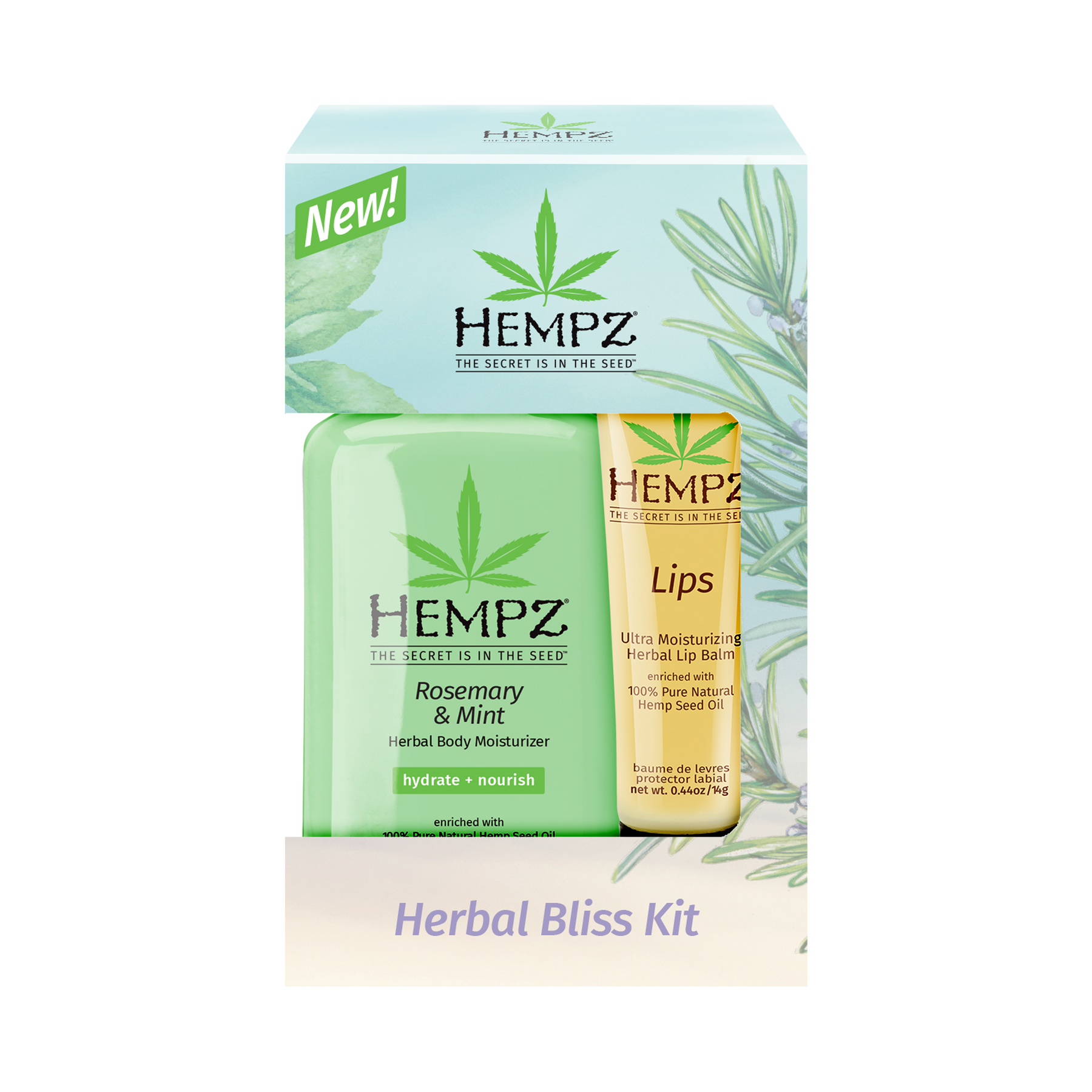 Indulge in the rejuvenating Hempz Herbal Bliss Kit. It includes a travel-size Rosemary & Mint moisturizing lotion and our cult favorite Herbal Lip Balm. Both hydrate with 100% pure hemp seed oil. SCENT Rosemary & Mint, Sweet Citrus The perfect set to take on the go BENEFITS BUTTER ME UP Helps support skin's natural moisture barrier with shea butter and 100% pure hemp seed oil ACAI YOU Help reduce skin irritation and lessen redness with acai berry extract MINT TO BE Helps soothe irritation and inflammation with peppermint oil SUNNY DAY Help hydrate and heal skin with sunflower seed oil,...
