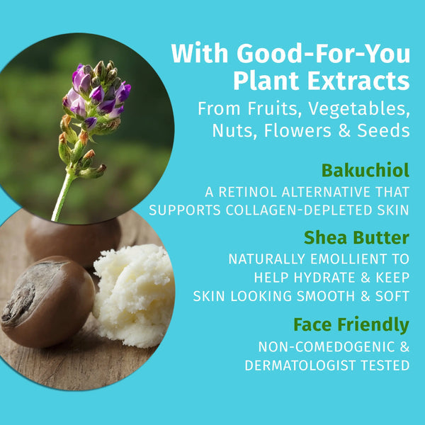 Helps reduce the appearance of wrinkles and fine lines, helping skin look younger, with bakuchiol