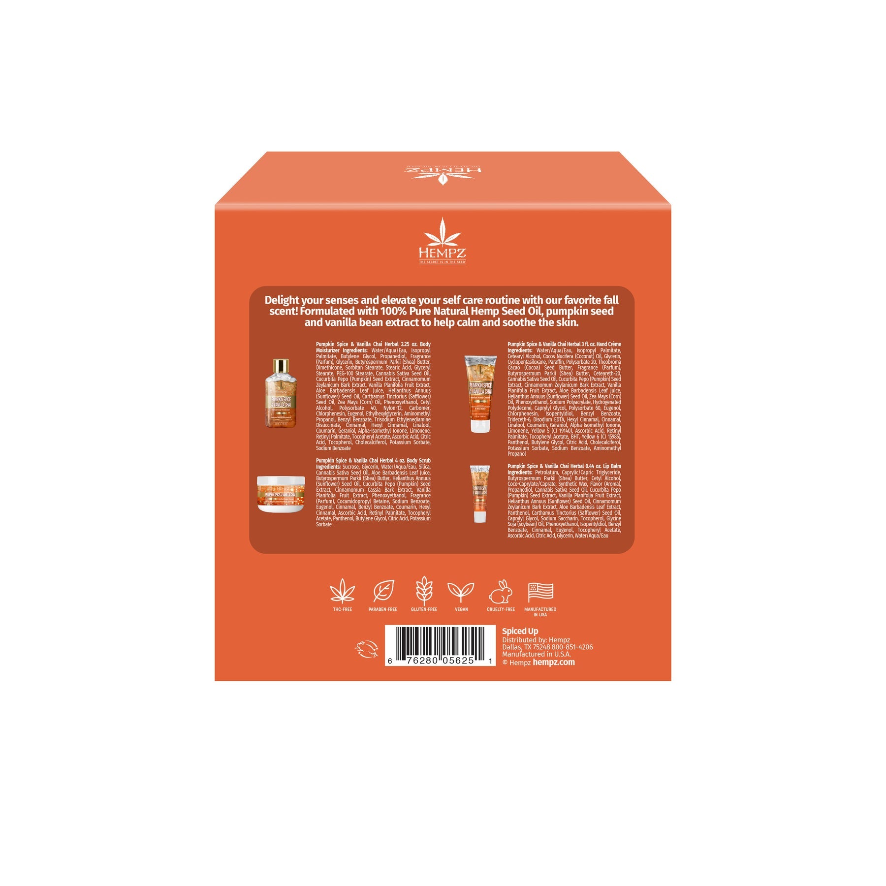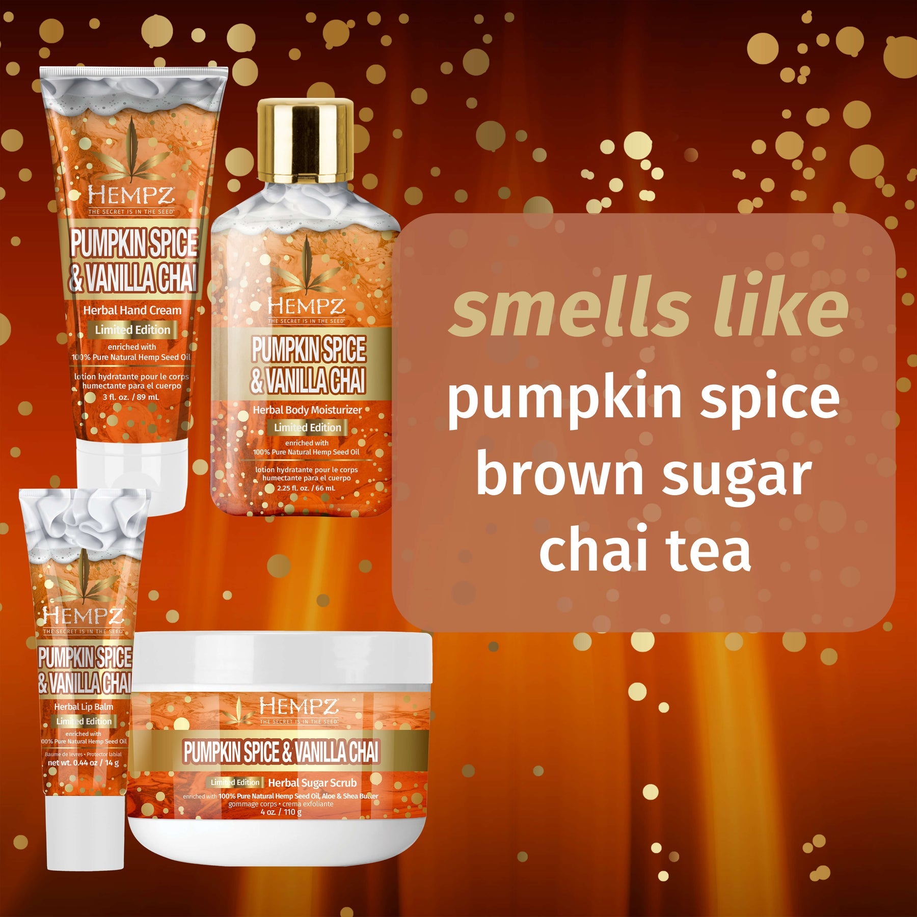 Embrace autumn with our Pumpkin Spice & Vanilla Chai Set. Enriched with 100% hemp seed oil and a cozy scent, each leaves skin soft and hydrated. The set includes, all in the Pumpkin Spice & Vanilla Chai scent:• Body Sugar Scrub, 4oz• Travel-Size Body Moisturizer, 2.25oz• Hand Cream, 3oz• Lip Balm, 0.44oz SCENT Pumpkin Spice & Vanilla Chai With notes of pumpkin spice, brown sugar & chai tea BENEFITS VANILLA SMOOTHIE Seals in moisture and leaves skin soft with vanilla extract KEEP CALM Calms and soothes skin with shea butter and pumpkin seed extract SPICE GIRL Helps calm skin and...