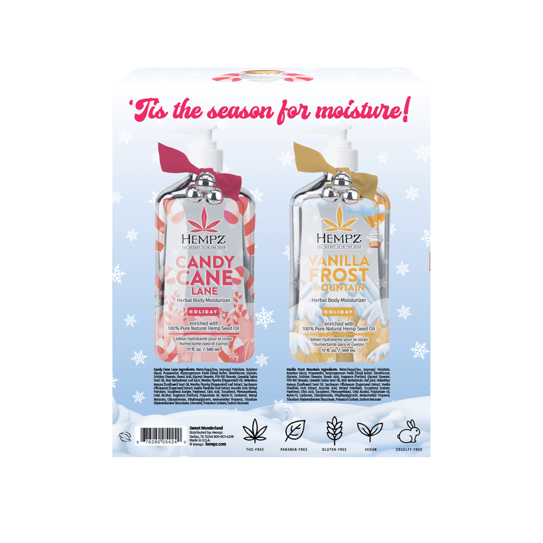 Experience a double dose of sweetness with this delightful duo. This set includes two NEW limited-edition holiday lotions—cheery Candy Cane Lane and cozy Vanilla Frost Mountain.