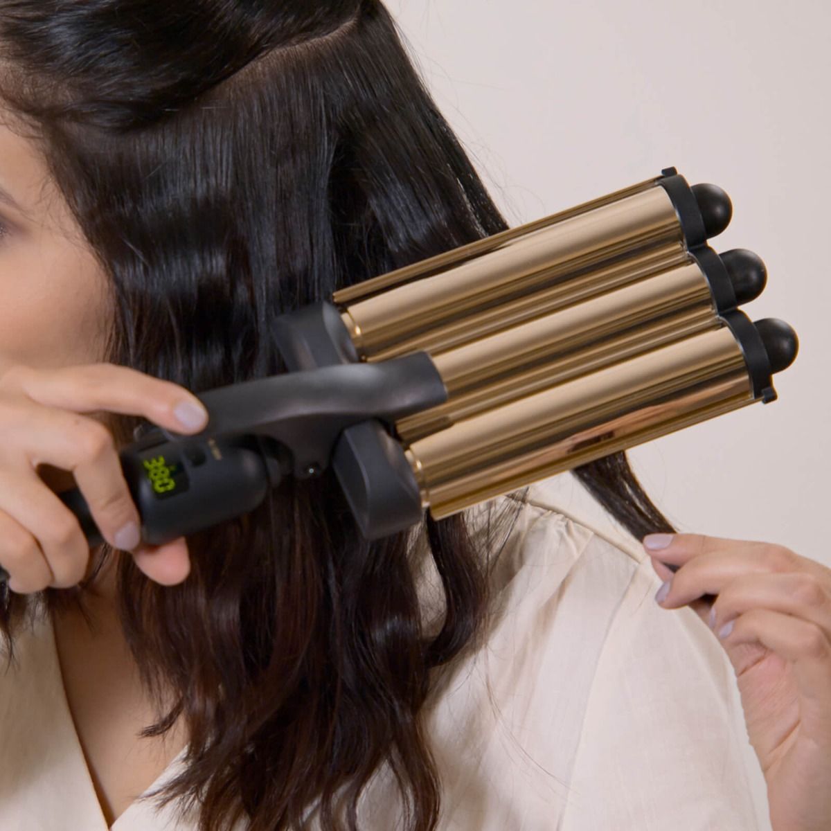 This three-barrel waver creates effortless beachy waves — whatever the season. The 24K Gold 3 Barrel Waver makes it easy to create professional waves. Pulse technology and a gold styling surface provide fast even heat distribution for long-lasting, salon-quality results. With precision heat settings up to 450°F, this waver styles all hair types with ease. FeaturesVariable heat settings up to 450℉ for all hair typesDigital precision heat settings for ultimate styling controlSoft Touch finish for a comfortable gripTwo-hour auto shut-off and power indicator light for peace of mindFoldaway safety stand for easy storingPulse Technology® "Gets Hot... Stays Hot®"Universal dual voltage...