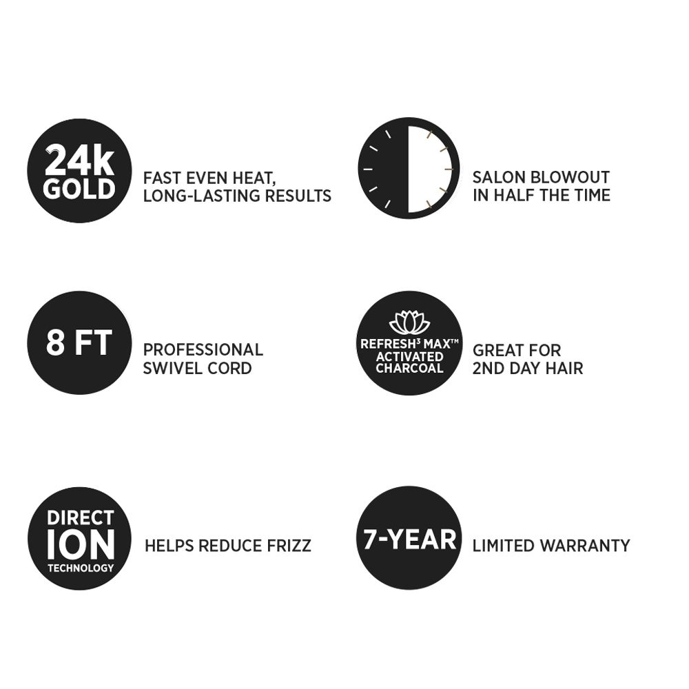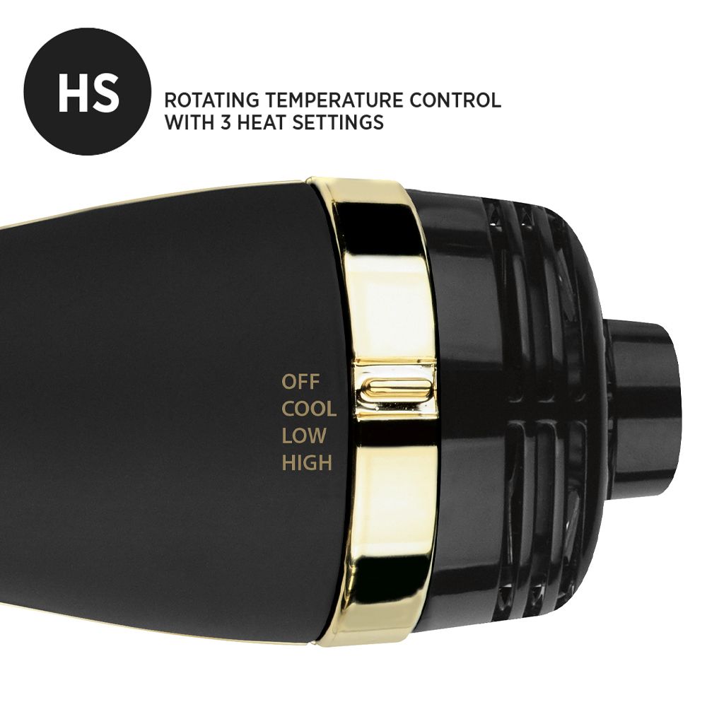 Top Features: •Professional tool for professional results. Get simple, beautiful blowouts with one tool. •Styling surface designed with the unparalleled 24K Gold Technology for even heat distribution and consistent results for all hair types. •Charcoal-Infused Bristles are perfect for refreshing 2nd day hair! •Designed with an ALCI safety plug (required for U.S. hair dryers). •Rotating temperature control with 3 speed settings provides styling versatility and great results on all hair types.