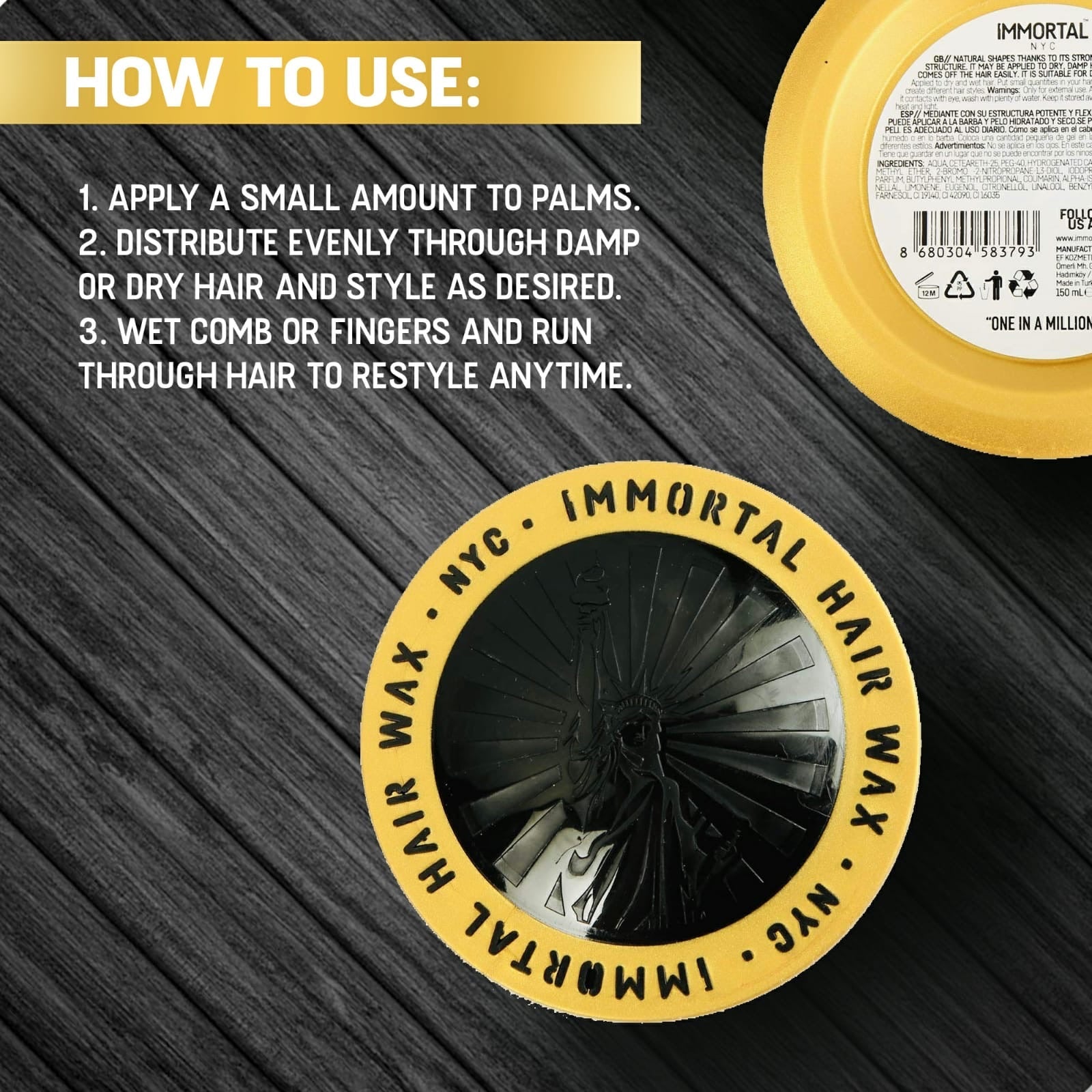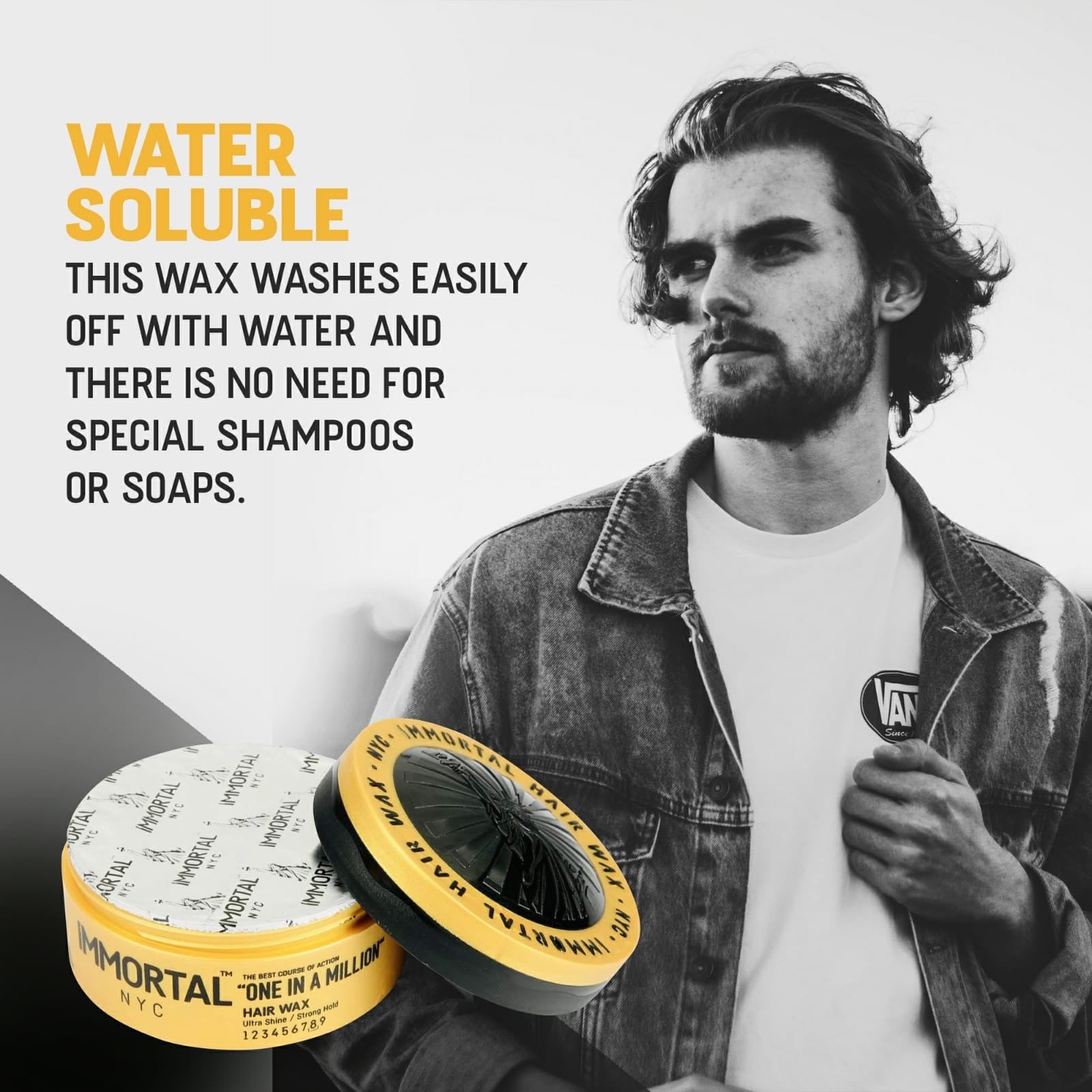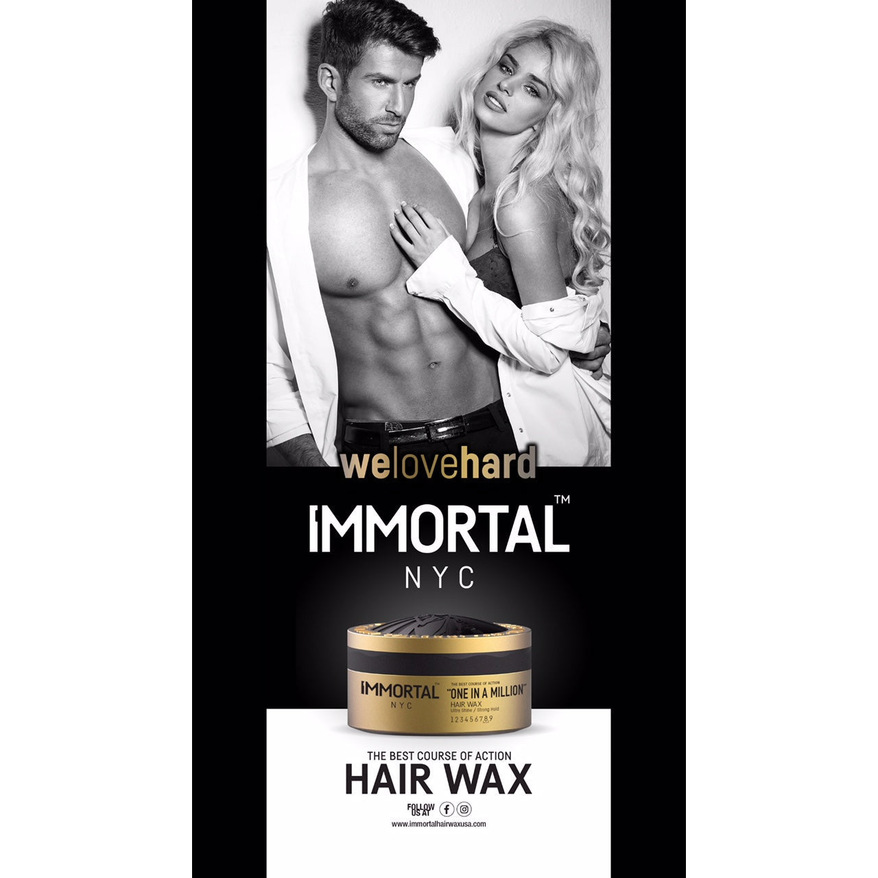 Immortal NYC One in a Million Hair Wax provides flexible hold with no damaging effects to hair. It adds massive texture to your hair and resiste the effects of humidity, letting you create a wide range of fancy styles that will last. This wax provides a holding ability of 8 on a scale of 1-9. 150 l./5.07 fl. oz.