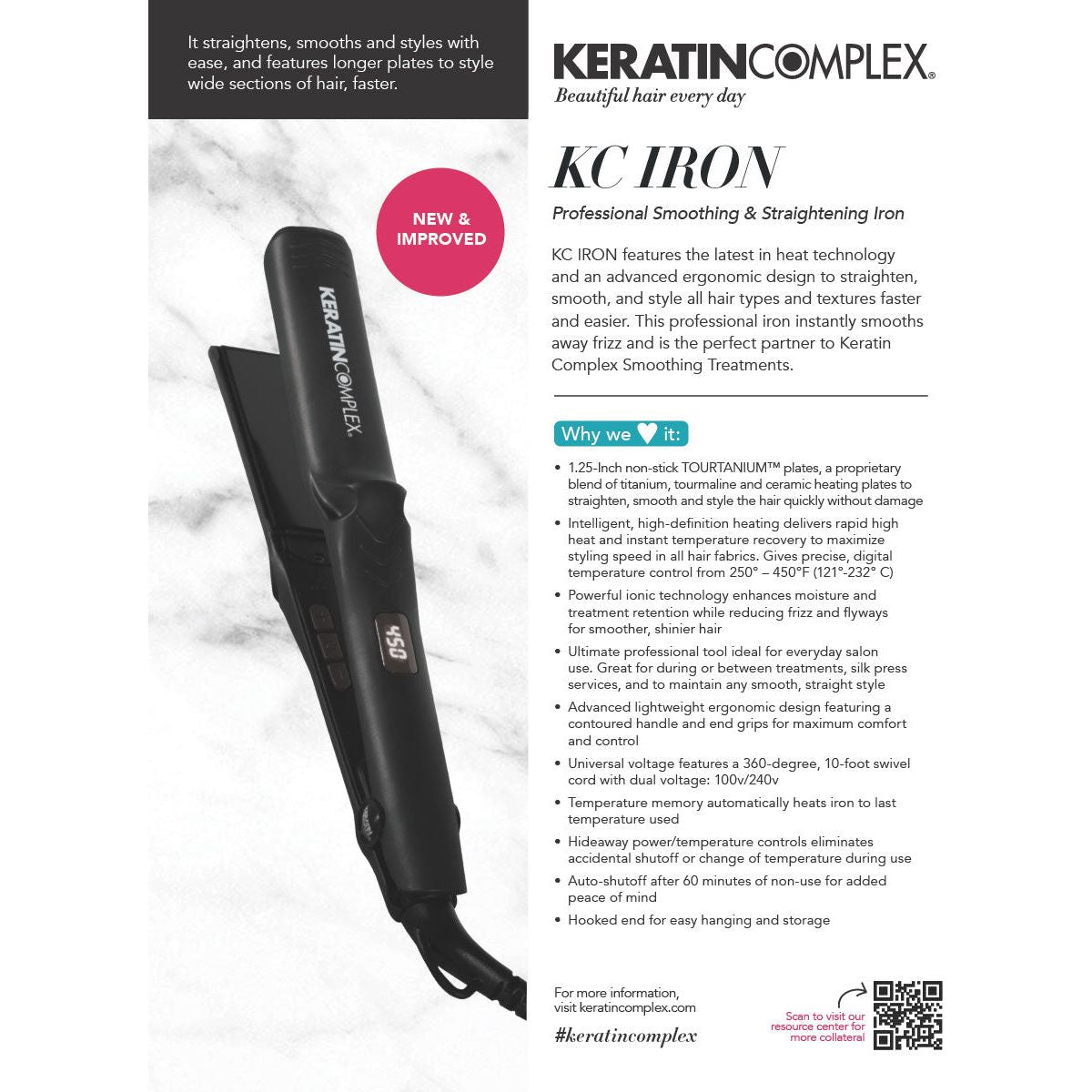 KC IRON features the latest in heat technology and an advanced ergonomic design to straighten, smooth, and style all hair types and textures faster and easier. This professional iron instantly smooths away frizz and is the perfect partner to Keratin Complex Smoothing Treatments.