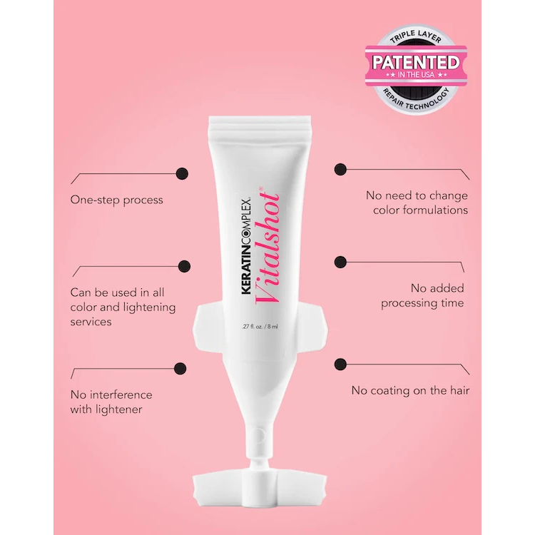 VITALSHOT is a simple add-on for all coloring and lightening processes, eliminating the need to change color formulations or extend processing times, and it doesn't leave any lasting residue on the hair.