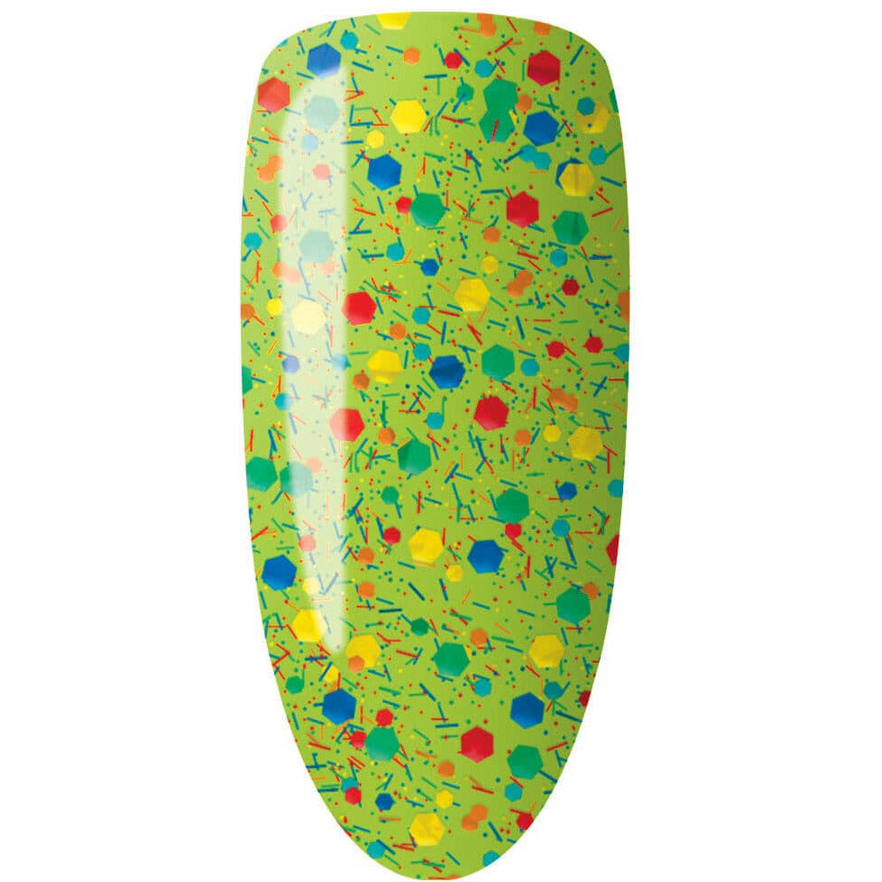 Red, green, blue and yellow hexes with green and yellow glitters on a green yellow base.