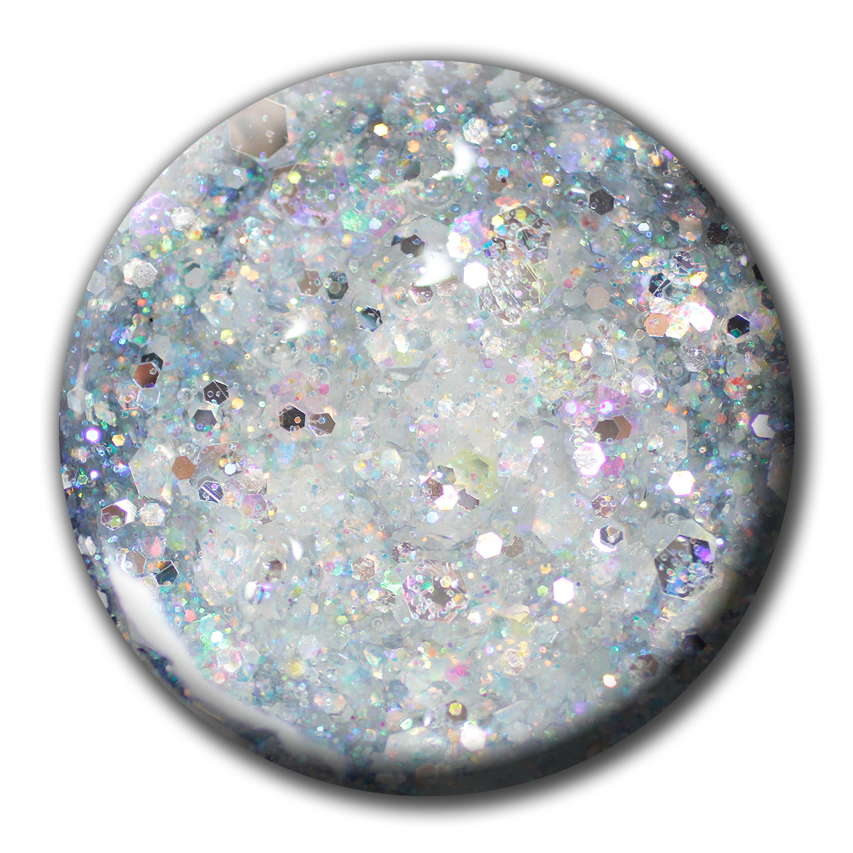 This glitter has silverish grey chunky pieces mixed in with smaller iridescent sparkles. It's not quite a full coverage glitter which makes it soft and delicate. This color makes a statement in a very subtle way!