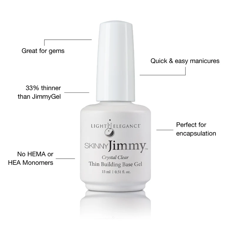 Light Elegance, a leader in innovative nail products, is proud to announce the launch of Skinny JimmyGel (AKA "SkinnyJimmy"), a revolutionary building base gel for fast overlays, gem application and encapsulation. Skinny JimmyGel is meticulously formulated to meet the demands of modern nail professionals. With a 33% thinner viscosity than the original JimmyGel, Skinny JimmyGel offers even faster overlays. Perfect for busy salons, Skinny JimmyGel enables nail technicians to achieve flawless overlays in record time, enhancing productivity and client satisfaction. The gel's thin consistency ensures that gems and embellishments adhere securely and smoothly, creating stunning nail art with ease....