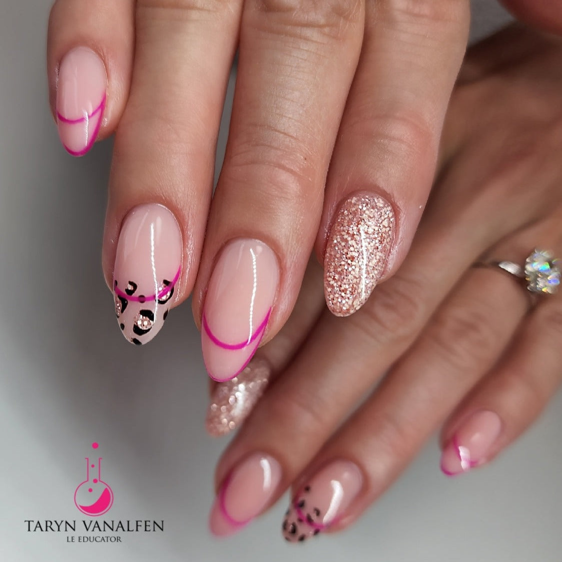 A sparkly, light rose-gold with matte white pieces throughout. The combination of sparkle and matte make for a stunning and sophisticated neutral salmon pink.