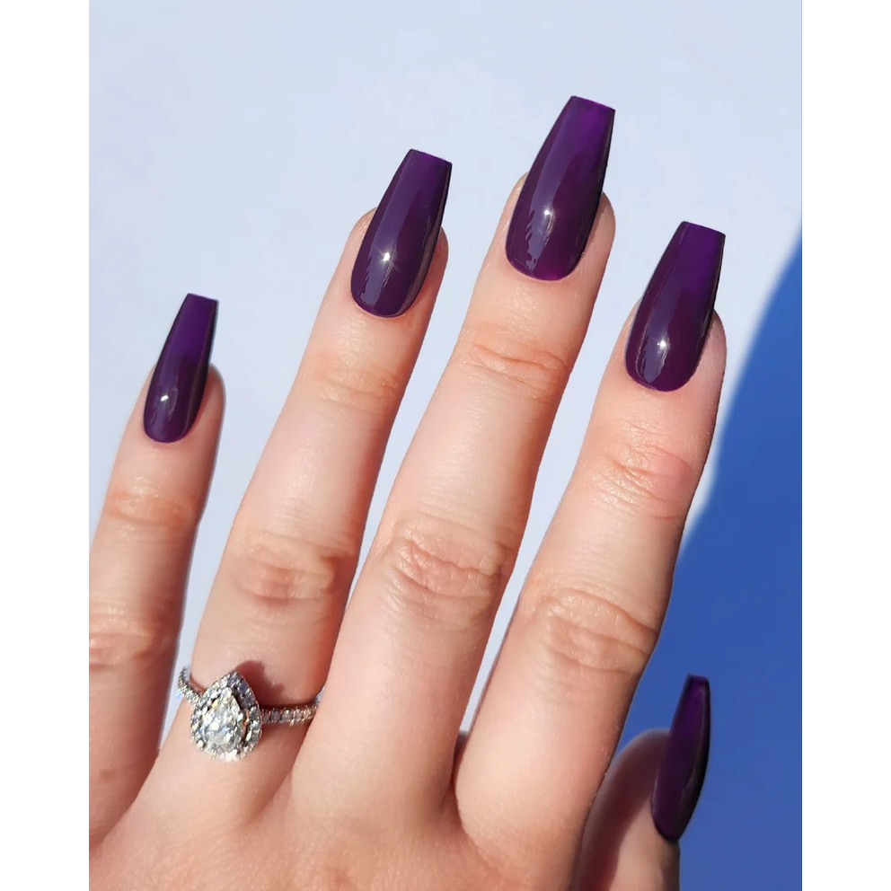 A deep, dark plum-purple. This creamy purple is a touch muted—not too bright—but powerful and bold enough to make a statement with your sophisticated look.
