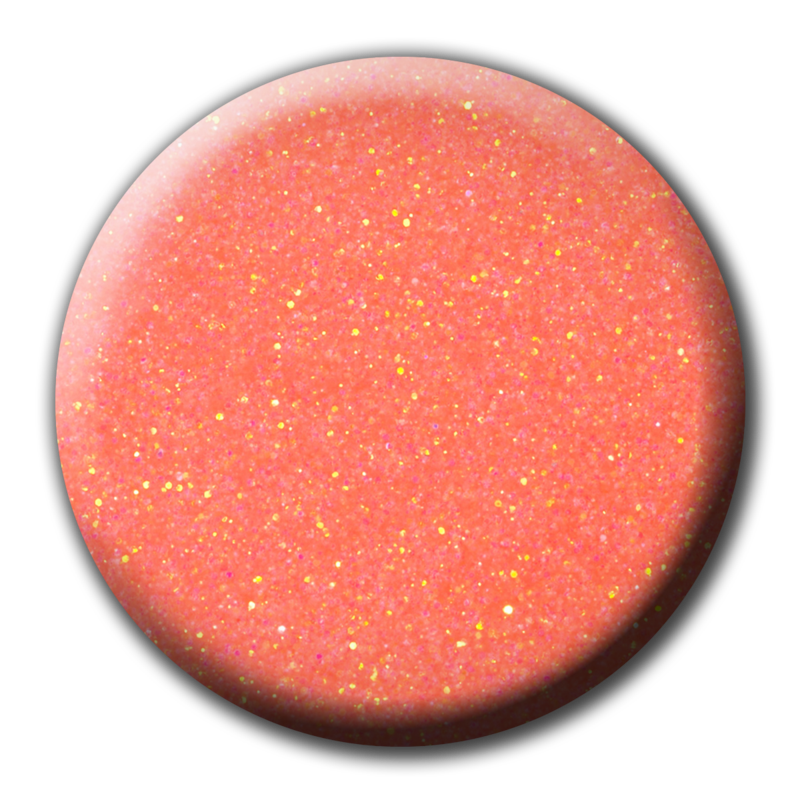 A fire orange, peachy glitter that flashes yellow gold & light green. A soft glitter that goes well over oranges and pinks. This translucent glitter can have many different looks!
