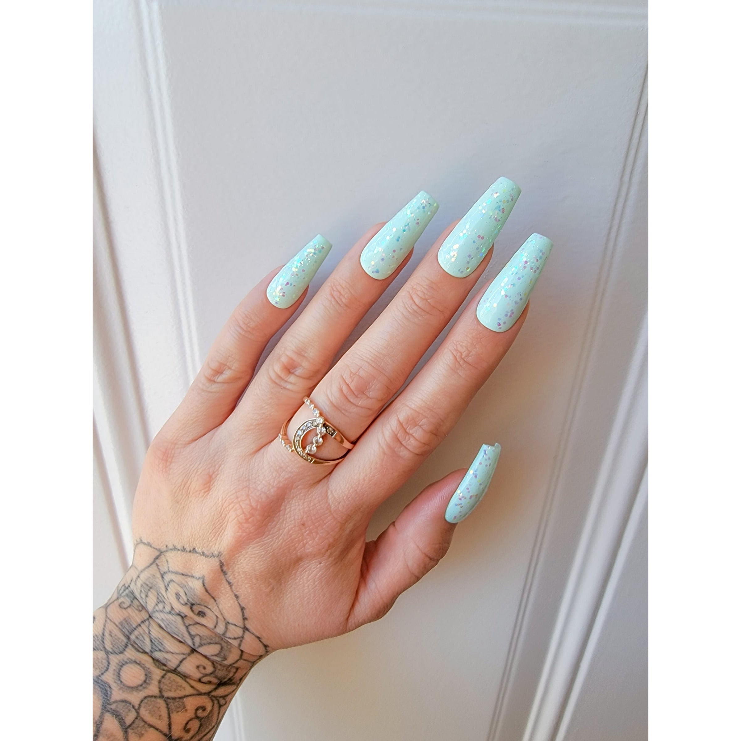 An iridescent glitter with a lot of flash. Sinfully Sweet is not too bold, and its large crystal pieces give it a soft, delicate look for soft Spring styles