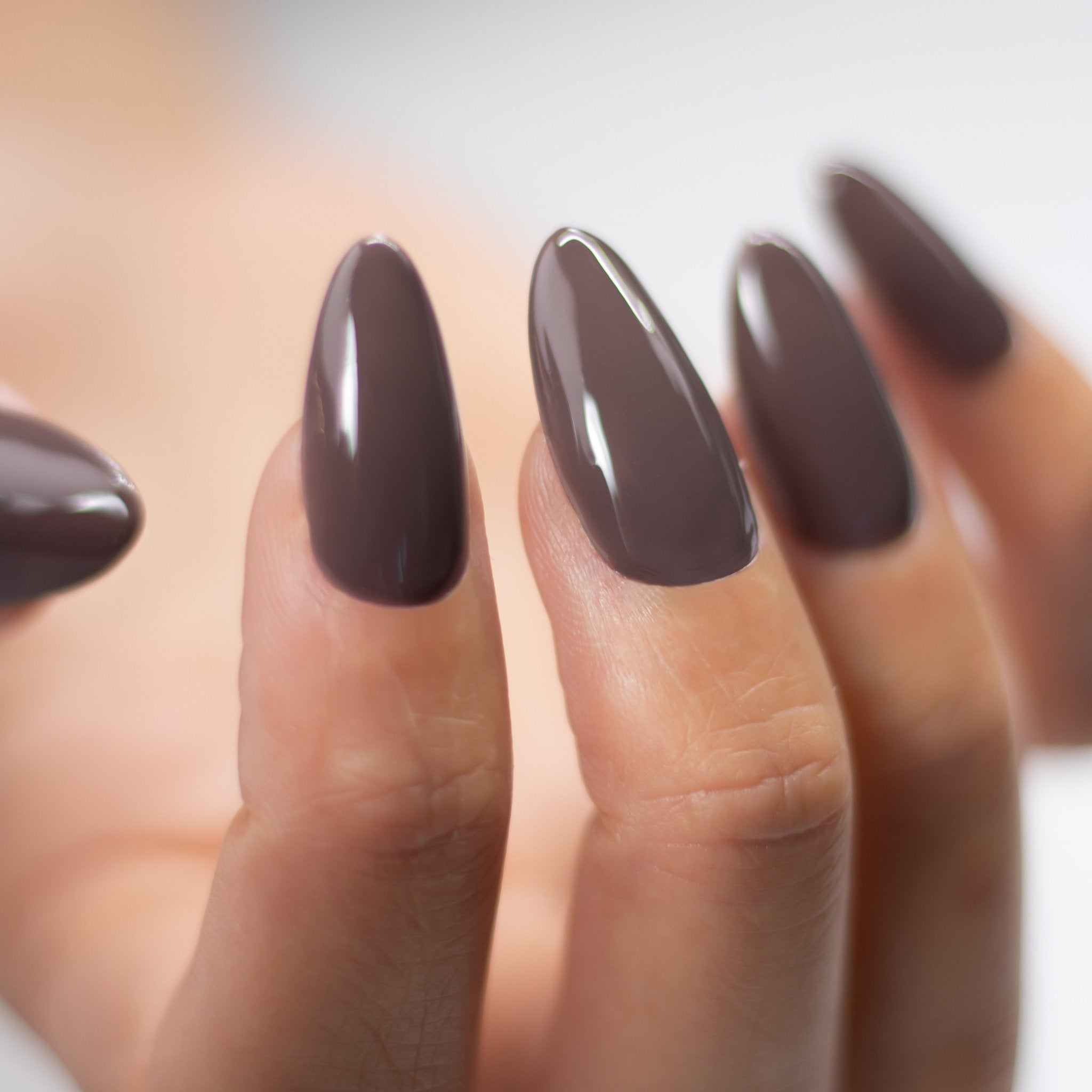 A sophisticated creamy brown-taupe. This dark, luscious brown pulls a touch of purple to make this a perfect, neutral taupe.