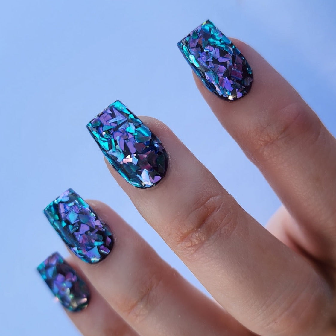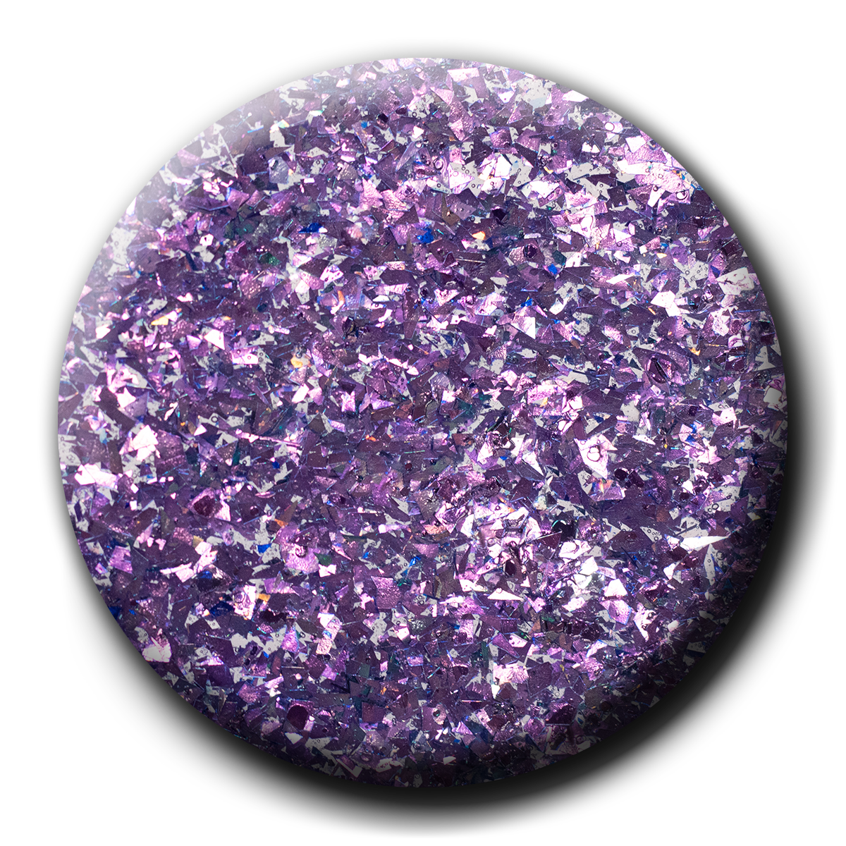 This chunky placement glitter is cut like glass and has a mirror-like, reflective shine. The dazzling glitter pieces are a mixture of lavender and bright teal—a unique and fun combination that can accent a wide variety of fun and fashionable looks.
