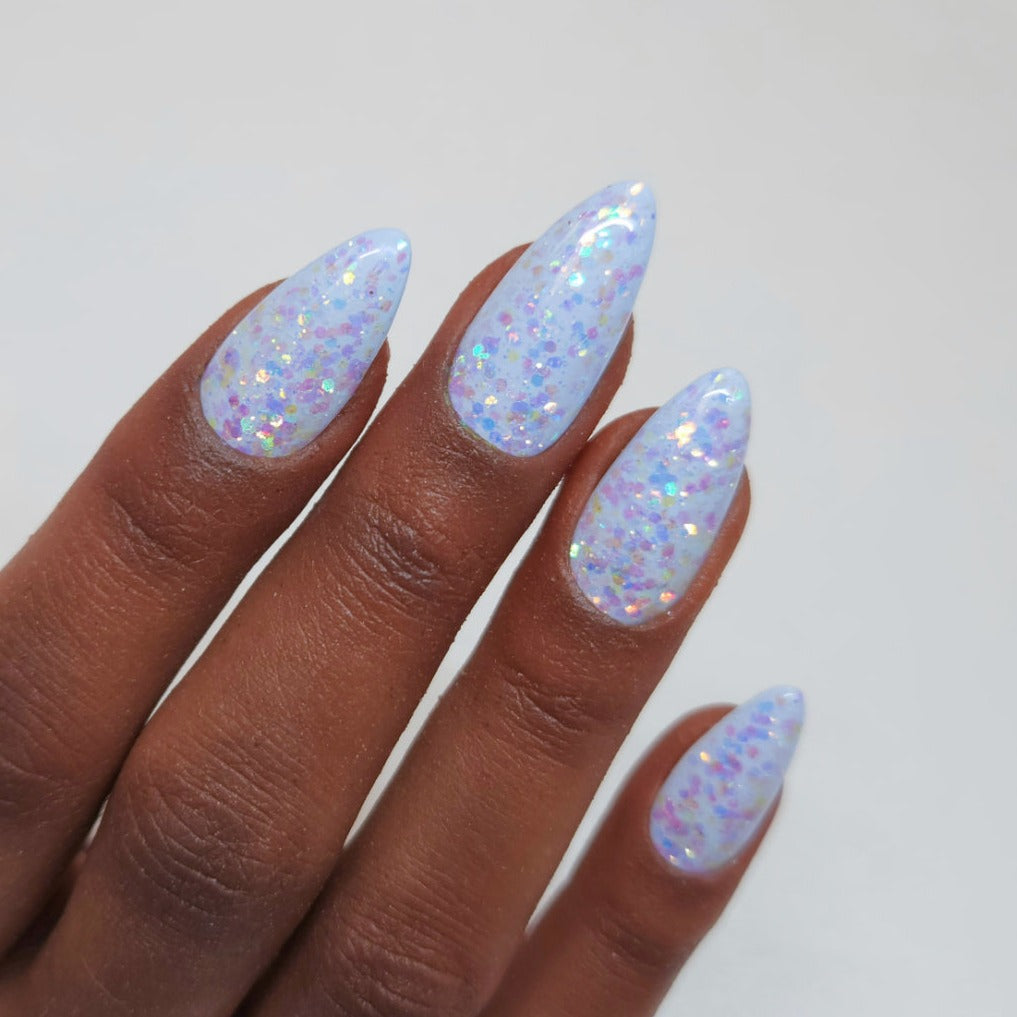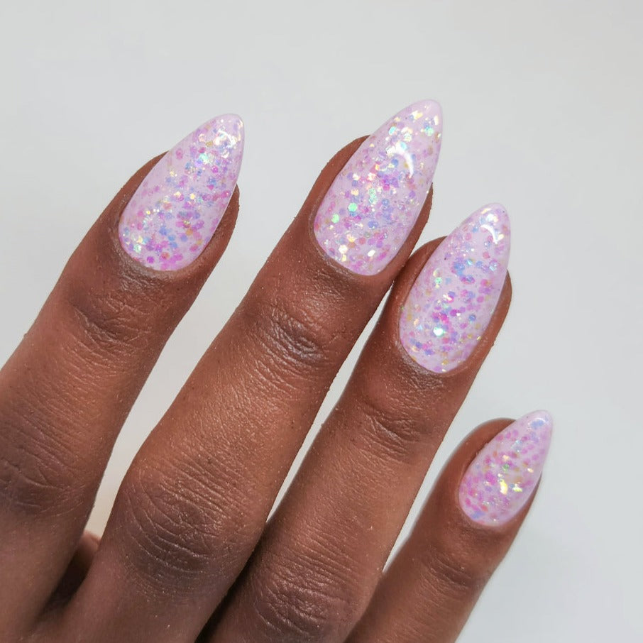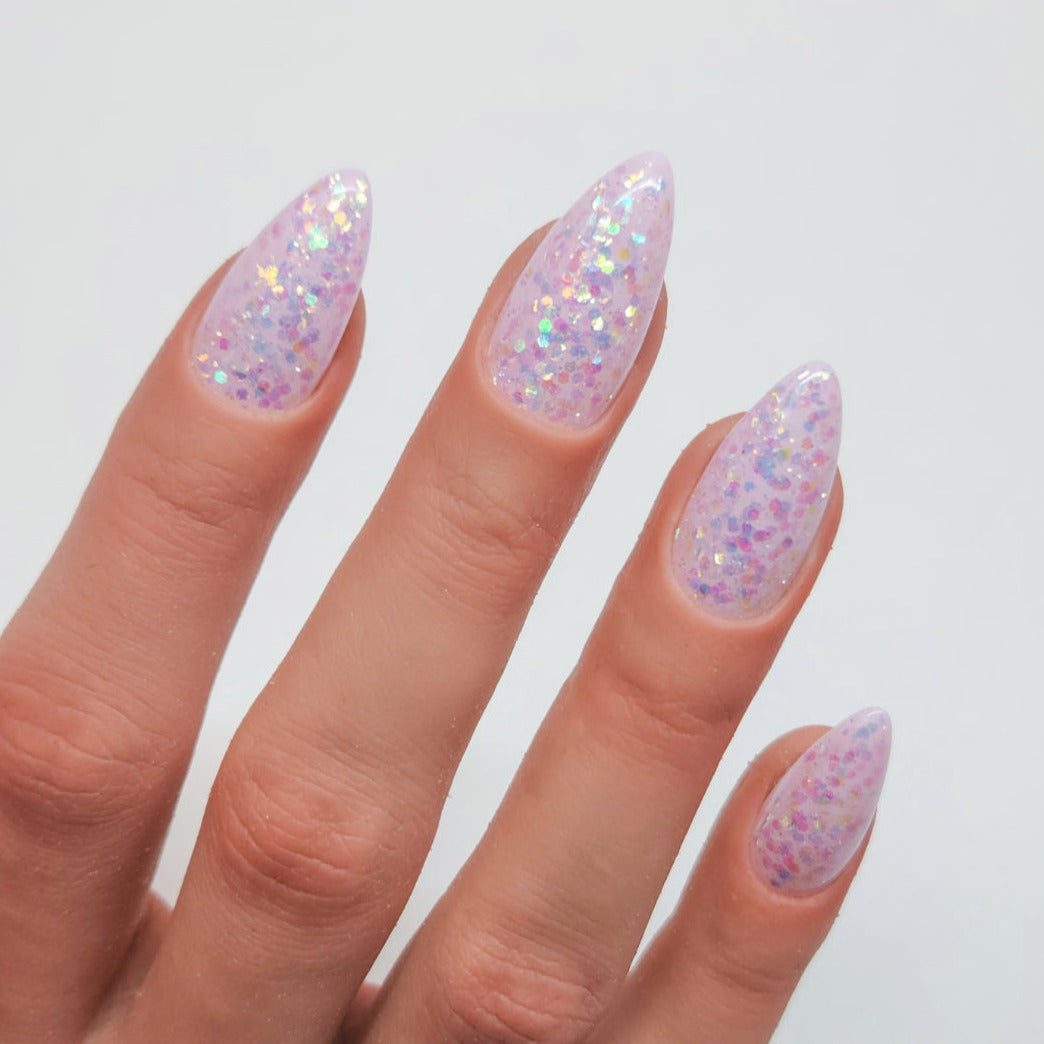 An iridescent glitter with a lot of flash. Sinfully Sweet is not too bold, and its large crystal pieces give it a soft, delicate look for soft Spring styles.