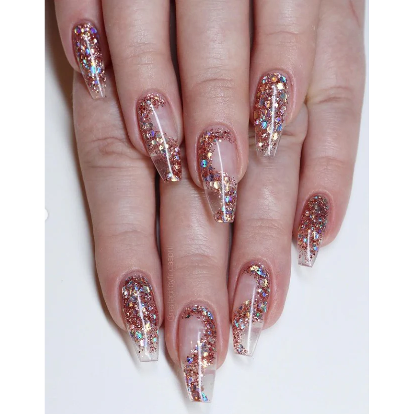 This medium salmon, rose gold glitter has jewel-toned chunky glitter throughout. It's flashy festive and extremely fun!