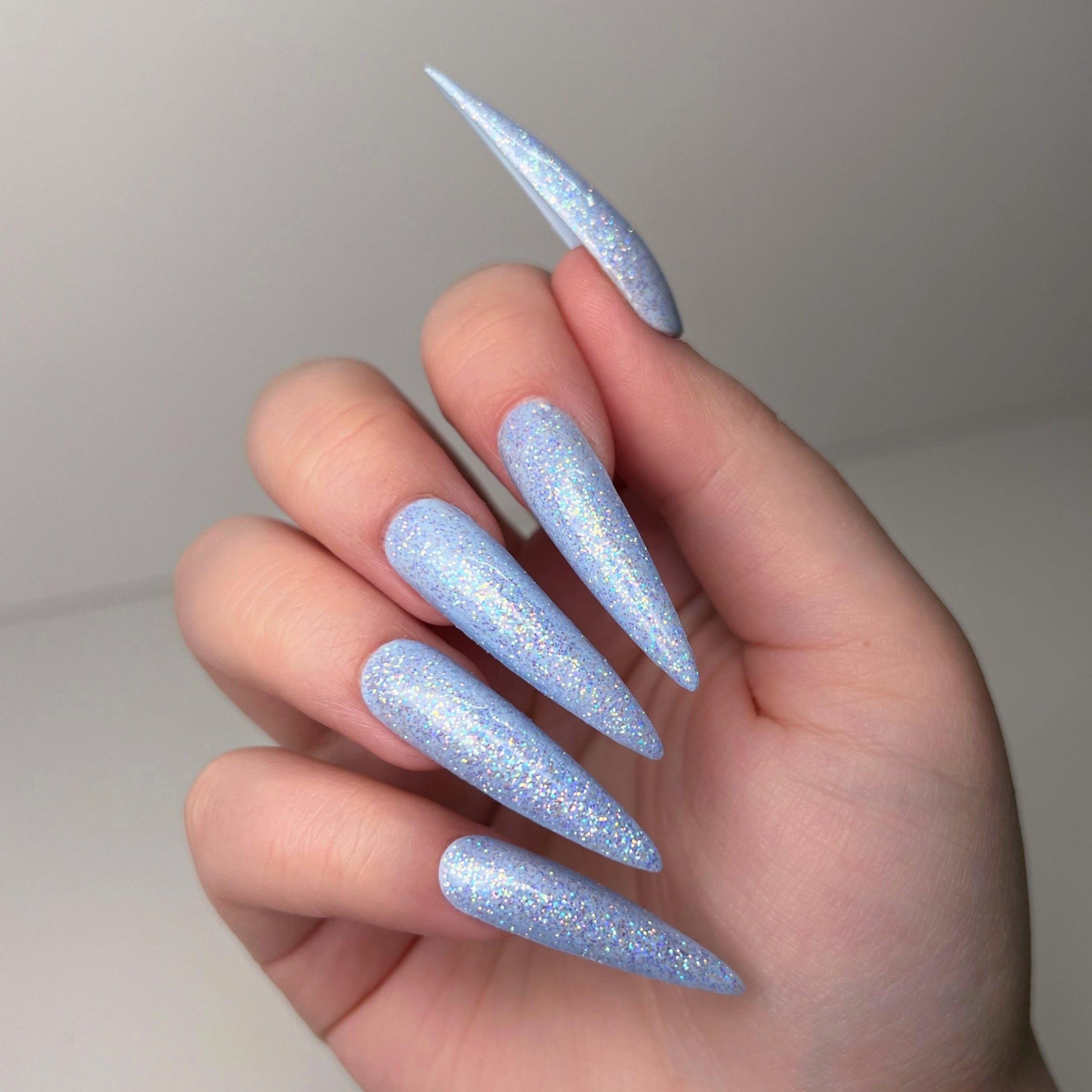 A true pastel pixie-blue Glitter Gel with lots of tiny firefly sparkles throughout. Pro Tip: One coat is soft and translucent, while two coats gives it a fun blue pop!
