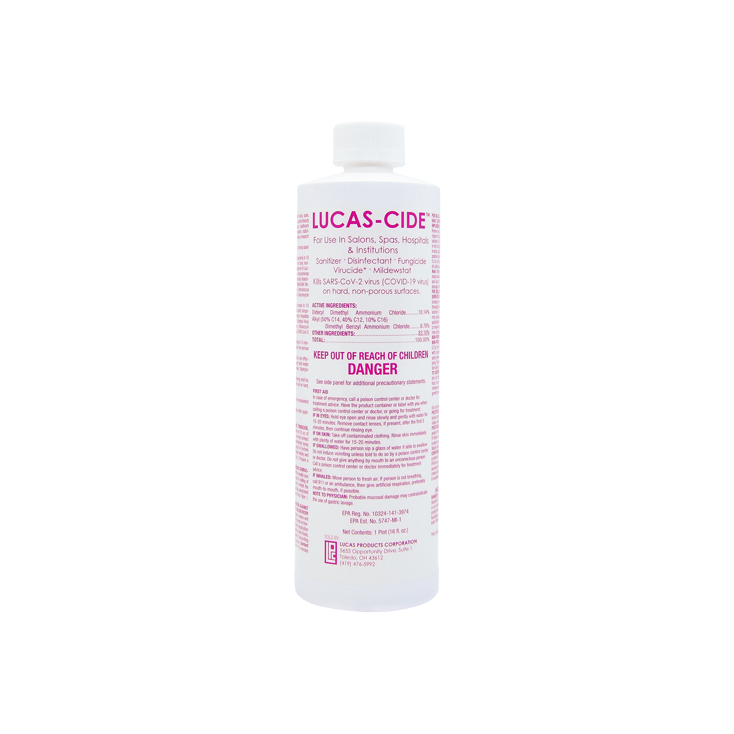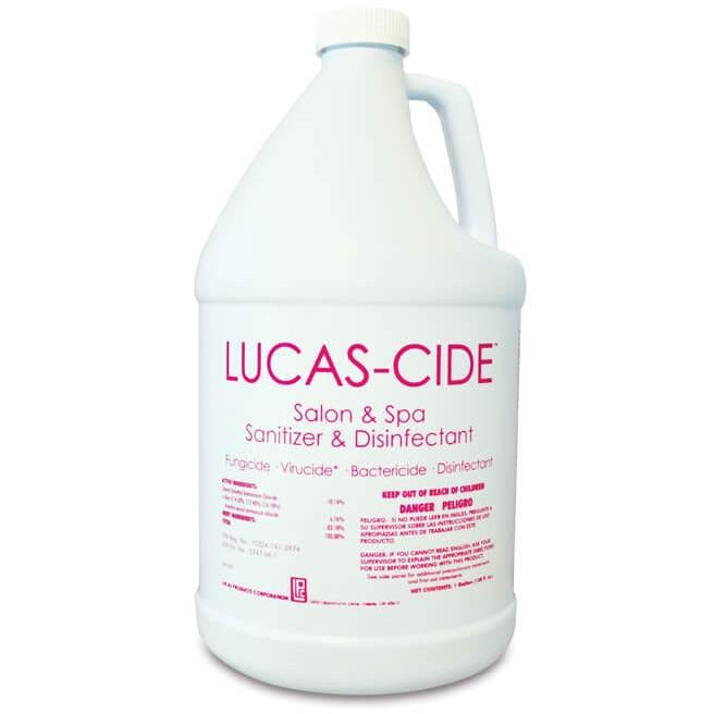 LUCAS-CIDE™ Salon and Spa Hospital Grade Disinfectant kills 99.999% of bacteria, viruses, and fungus in 60 seconds. 100% kill rate in 10 minutes. Most effective, least cost per ounce product available in the beauty industry. For use on any nail implements, pedicure spa’s, combs, shears, massage tables and any other hard surface which needs disinfecting or sanitizing.