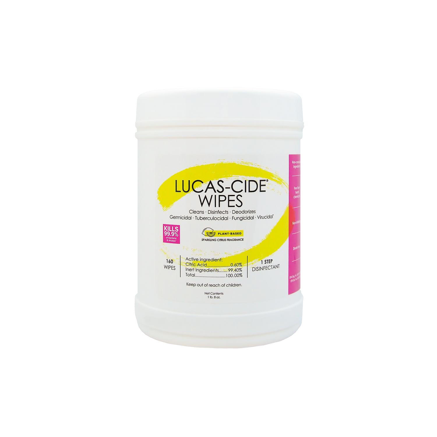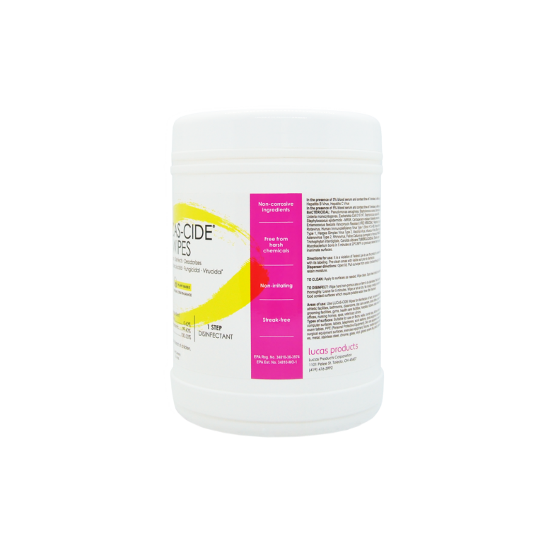 LUCAS-CIDE WIPES are tough on dirt and easy to use! Not only do LUCAS-CIDE WIPES harness the power of citric acid to knock out 99.9% of viruses and bacteria, the rinse-free formula leaves surfaces streak-free and won’t harm materials like acrylics and vinyl. LUCAS-CIDE WIPES have a sparkling citrus scent, they’re biodegradable and made in the USA. LUCAS-CIDE WIPES are on the EPA’s Lists N: Disinfectants for Coronavirus (COVID-19) and List Q: Disinfectants for Emerging Viral Pathogens (EVPs) – Including Monkeypox. Free of bleach, ammonia, chlorine, alcohol, parabens, phenols, glycol solvents, gluten, phosphate, formaldehyde One-step disinfectant Rinse-free formula offers full disinfection in 5...