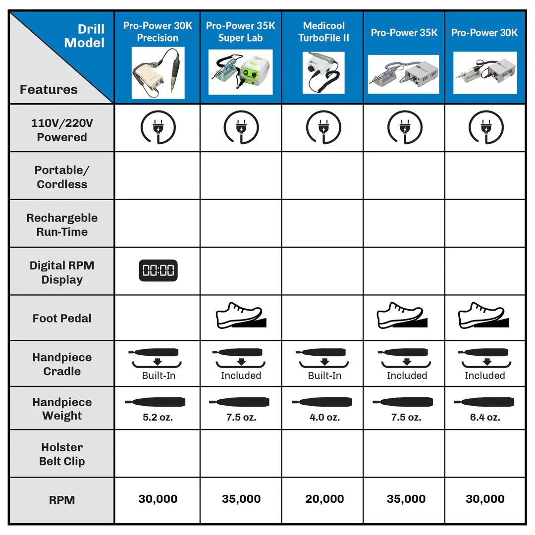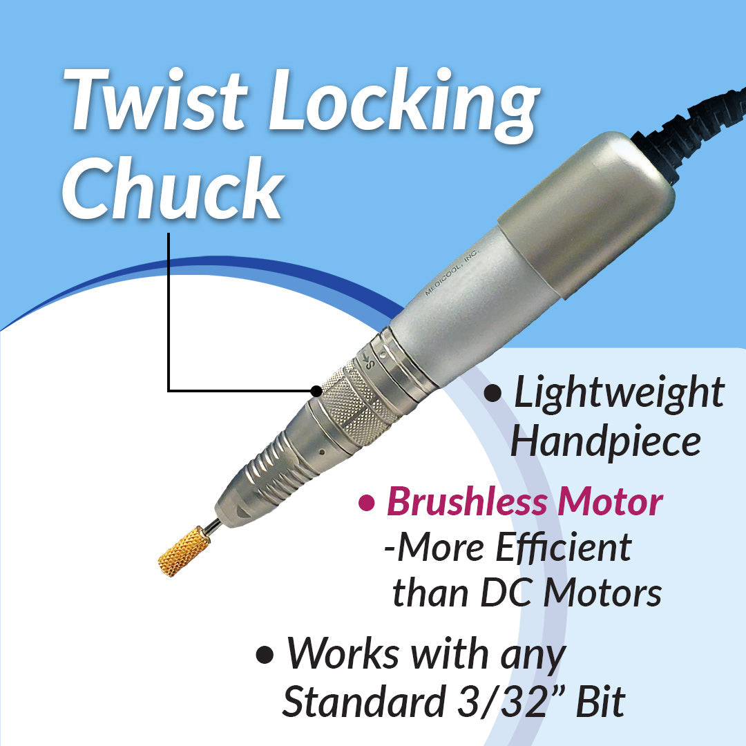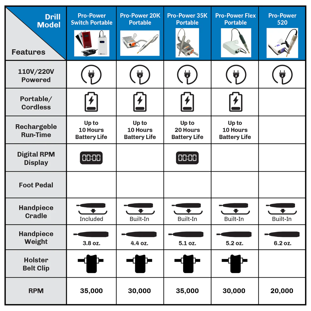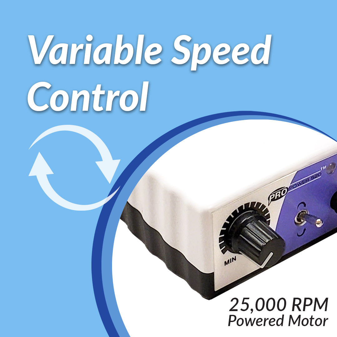 The Pro Power 520 Electric Filing System providing the Professional Nail Technician with the power and versatility to complete any manicure or pedicure service. Its lightweight space-saving design allows for convenient positioning on any workstation. It's the perfect high speed professional electric Manicure-Pedicure file designed for nail care professionals. 25,000 RPM Included 110v - 220v controller allowing use anywhere in the world. Full 1 Year Warranty. Extended Warranty Available. B52 Diamond Cone, E10 Mandrel and 6 Sanding Bands included. IMPORTANT: Handpieces will only function with matching Base Units. When ordering a New Hand Piece, please make sure it is the...